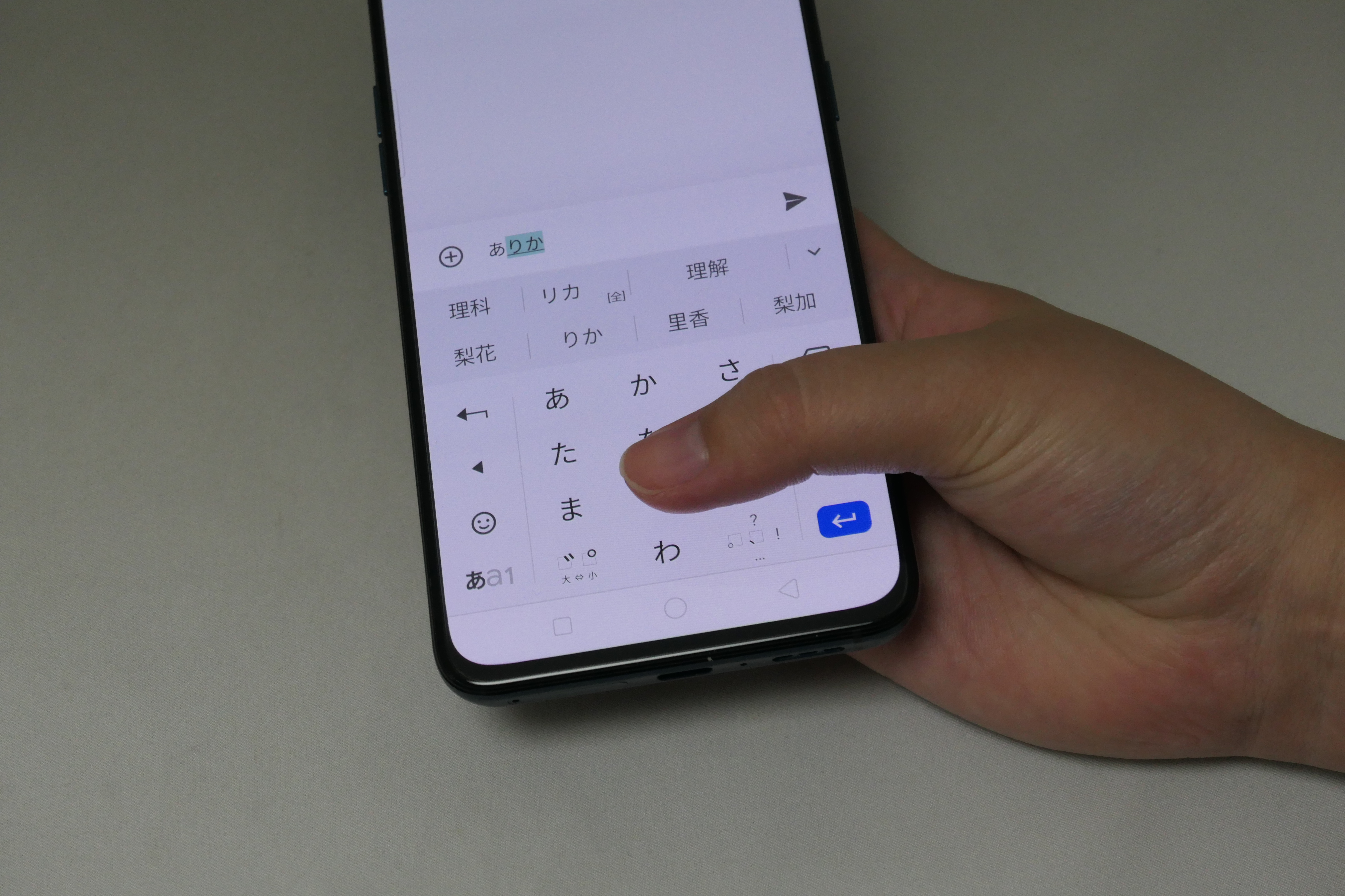 ▲サイズは約H162.0×W77.2×D9.3mmで、重さは約215g。女性に使ってもらったところ、片手での文字入力は厳しそうだった