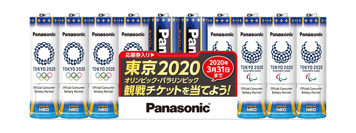 ▲乾電池「エボルタNEO 東京2020 オリンピック・パラリンピック 特別パック」。単3形と単4形、各6本パックと10本パックをラインナップ
