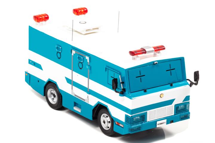 今回製作された限定モデルは、実際の仕様を43分の1スケールで忠実に再現。ガラス部分を覆う装甲版や各種赤色灯、銃眼などこの車両の特徴となる各種装備を可能な限り再現しています。