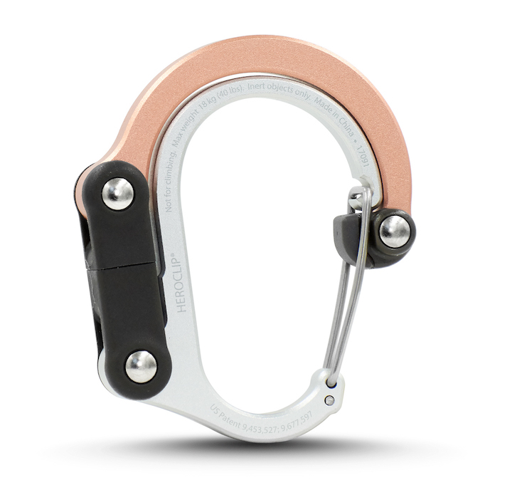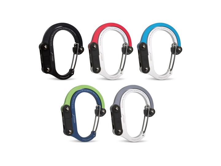 一般的なカラビナはオーバル型あるいはD型に近い形状をした金属環で、一部が内側に開閉する仕組みになっています。これに対して「HEROCLIP」では、カラビナの外側にひとまわり大きなC型フックがぴったりと沿う状態で付属しています。