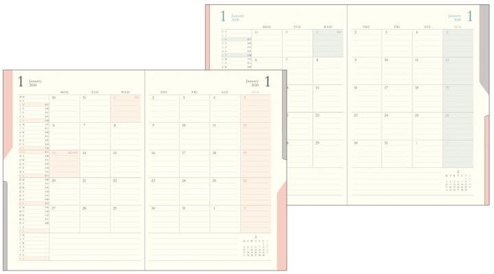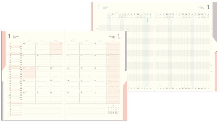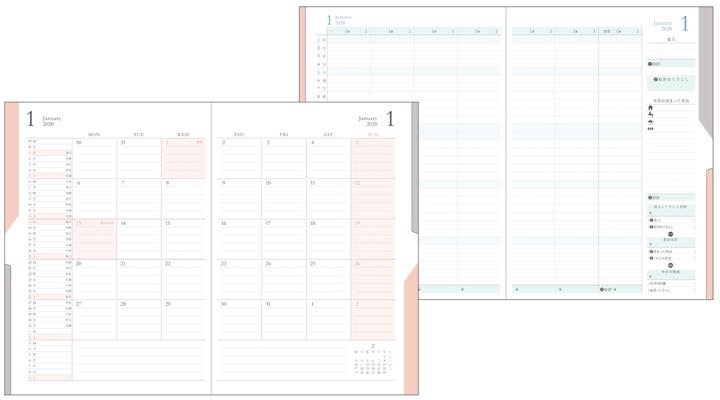 スケジュールページはシンプルな月間ブロックタイプ、プロジェクトページは各プロジェクトの予定や進捗を一目で把握できるガントチャート式のフォーマットを採用し、スケジュールページをめくると次ページに同月のプロジェクトページが続くという使いやすい構造です。