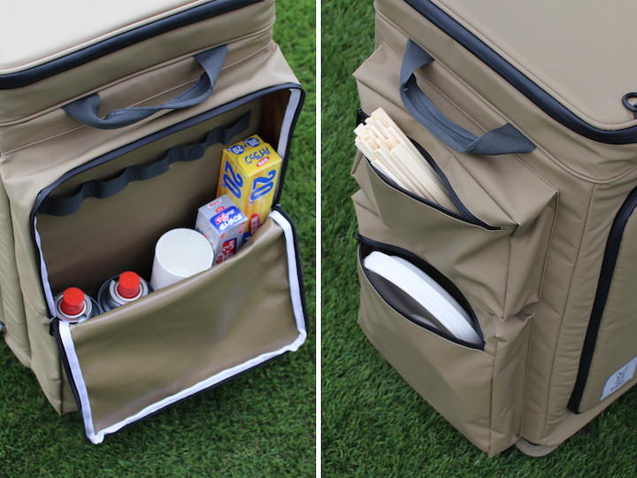 バーベキューに必要なアイテムも一緒に収納できるのが「バベコロ2」の大きな魅力。すぐに使いたい食材は上部の保冷スペースに。まな板や包丁、食器類など、食材以外の必需品は、左右合わせて3つあるサイドポケットに収納しておきましょう。