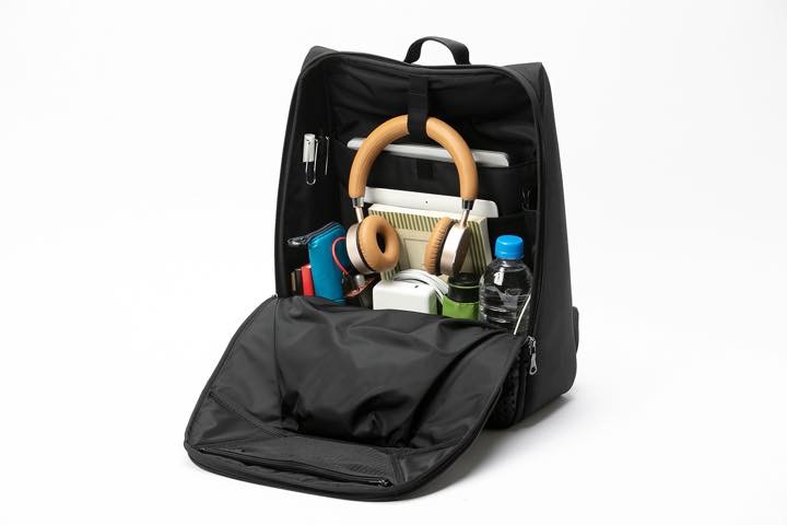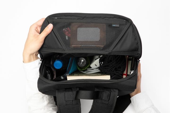 リュックなのに小さく開けられ、中身をパッと一目で把握できるのが便利! 普通のリュックでは取り出したい荷物が奥底に入ってしまい、開口部を大きく開く必要があります。その点、「ひらくPCリュック」なら、バッグの上部を少し開くだけで中身を俯瞰でき、スペースを広げず荷物を取り出し可能に。