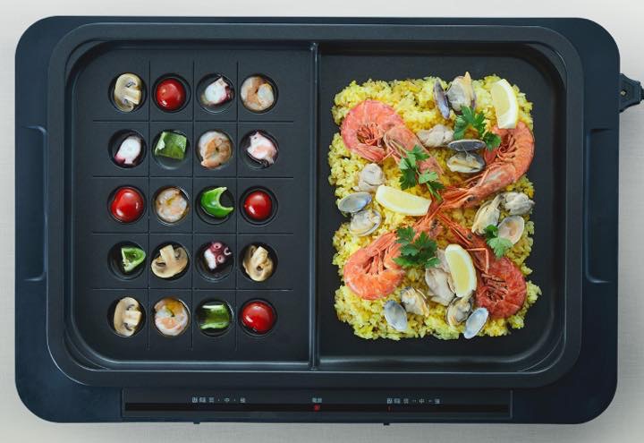 「平面プレート」の左右それぞれに「焼きごろお知らせマーク」を搭載し、最適な温度が簡単にわかるので、調理の失敗もありません。さらに「たこ焼き+平面プレート」なら、たこ焼きとお好み焼きなどを同時に調理したり、アヒージョとパエリアを同時調理したりといった幅広い調理が楽しめます。