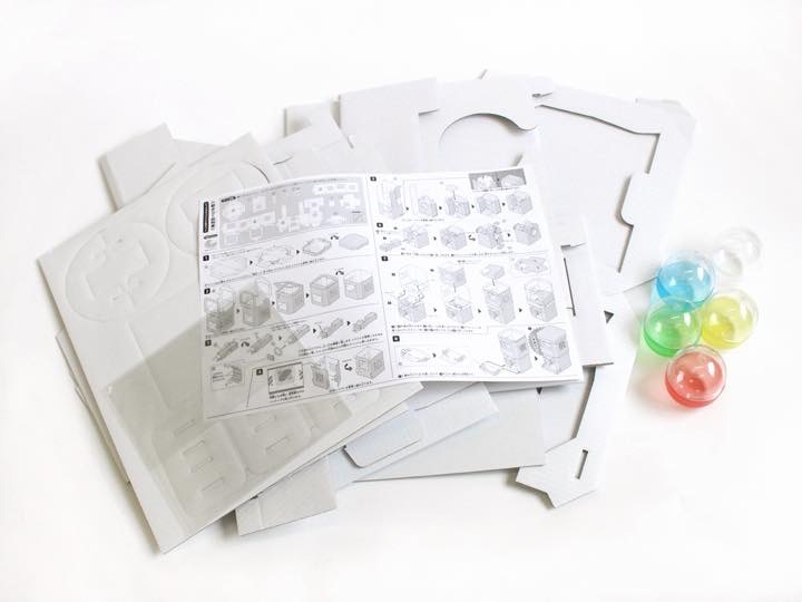 キットには、カット済みの段ボールと作り方の説明書とカプセルが入っており、自分の手で組み立てていくワクワク感を味わいながら、迫力満点のガチャマシーンを作れるのです。