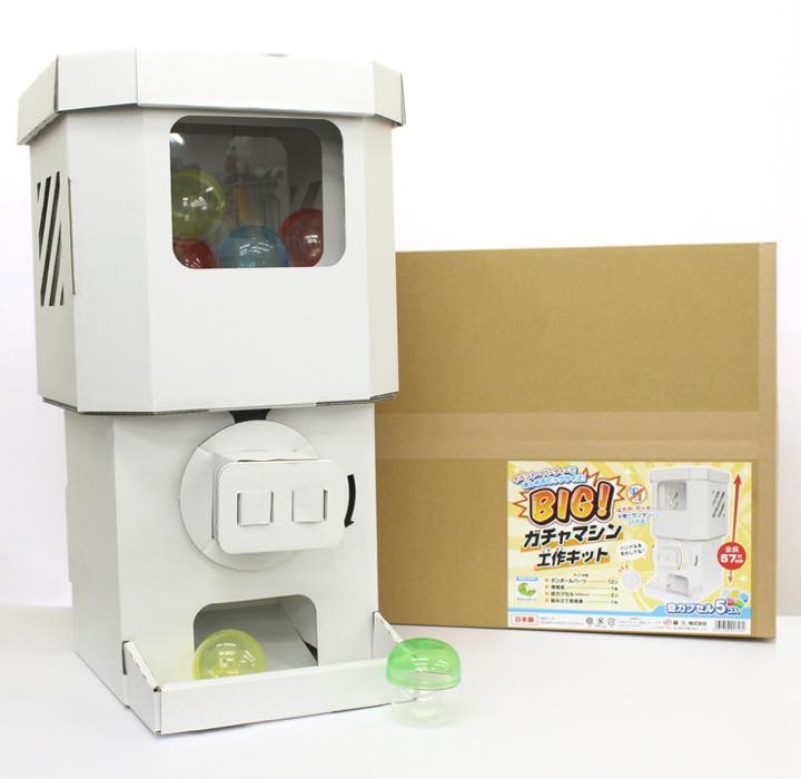段ボールで作る「ビッグガチャマシーン」(3100円/税別)は、本物のガチャマシーンとほぼ同じサイズ。実機と同じように実際にカプセルを入れ、回して遊べます。