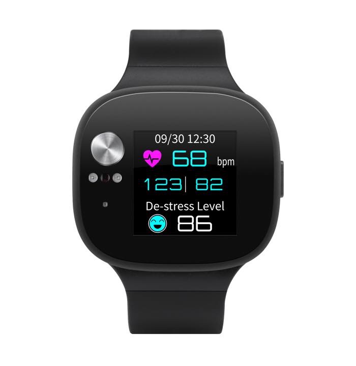 特徴的なのが、ECGとPPGというふたつの医療グレードのセンサー。本体の表面モニターの横に搭載された丸いシルバーの部分に指をあてると、PPGセンサーが血流を、ECGセンサーが脈波を測定し、心拍数と健康データを収集してくれるのです。