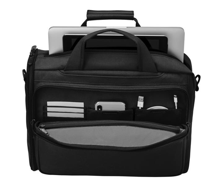 サイズはW40xH30xD17cm、960gとコンパクトかつ軽量ながら、収納量は抜群。メインコンパートメントには、14インチラップトップPCに対応したパッド入りの “ノートPC収納ポケット”、パッド入りの “タブレット収納ポケット” のほか、ワイドジッパー式ポケットがひとつ、蓋部にジッパー式ポケットがひとつ設けられています。またメインコンパートメントからは縦、横どちらからでもスムーズに書類やノートPCを取り出せます。
