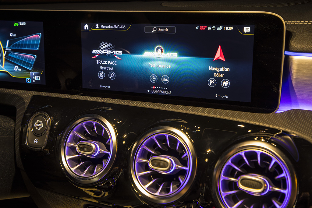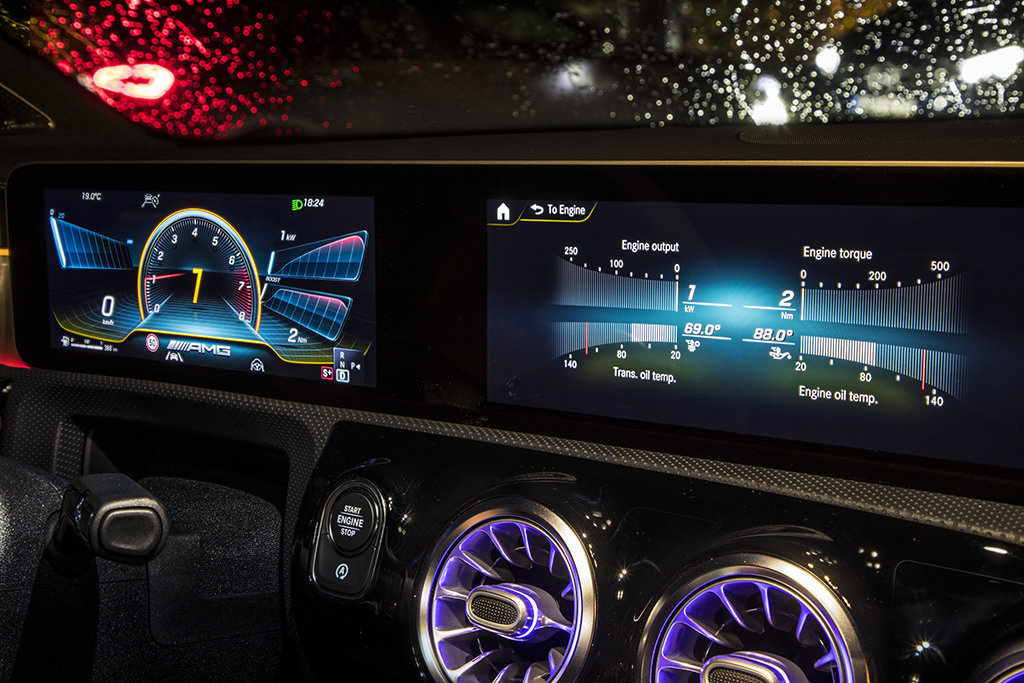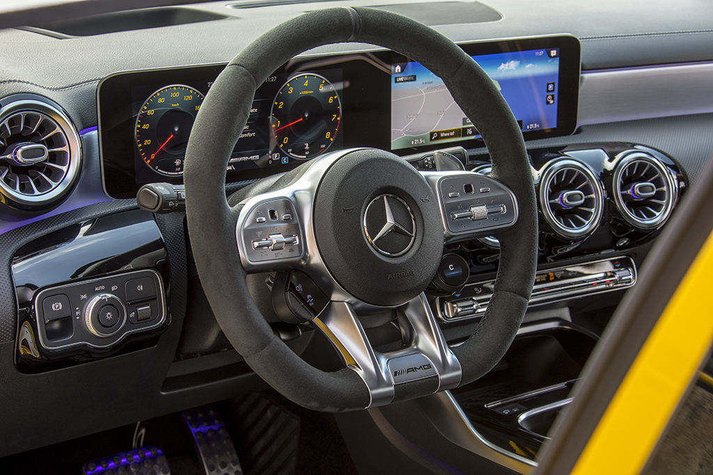 例えばエンジンは、2リッターの直列4気筒ターボで、最高出力306馬力、最大トルク40.8kgf-mと、リッター当たり150馬力以上を発生する超高性能仕様。そこに、ベースモデルのAクラスよりも変速スピードを早めた、7速のデュアルクラッチ式トランスミッション“AMGスピードシフトDCT 7G”と、4輪駆動の4マチックを組み合わせることで、静止状態から100km/hまで、わずか4.7秒で加速していく。高速サーキットにでも持ち込まない限り、動力性能は十分と思えるレベルで、豪快なエンジンサウンドとともにみなぎるパワーは、まさにAMGワールド全開という印象だったよ。
