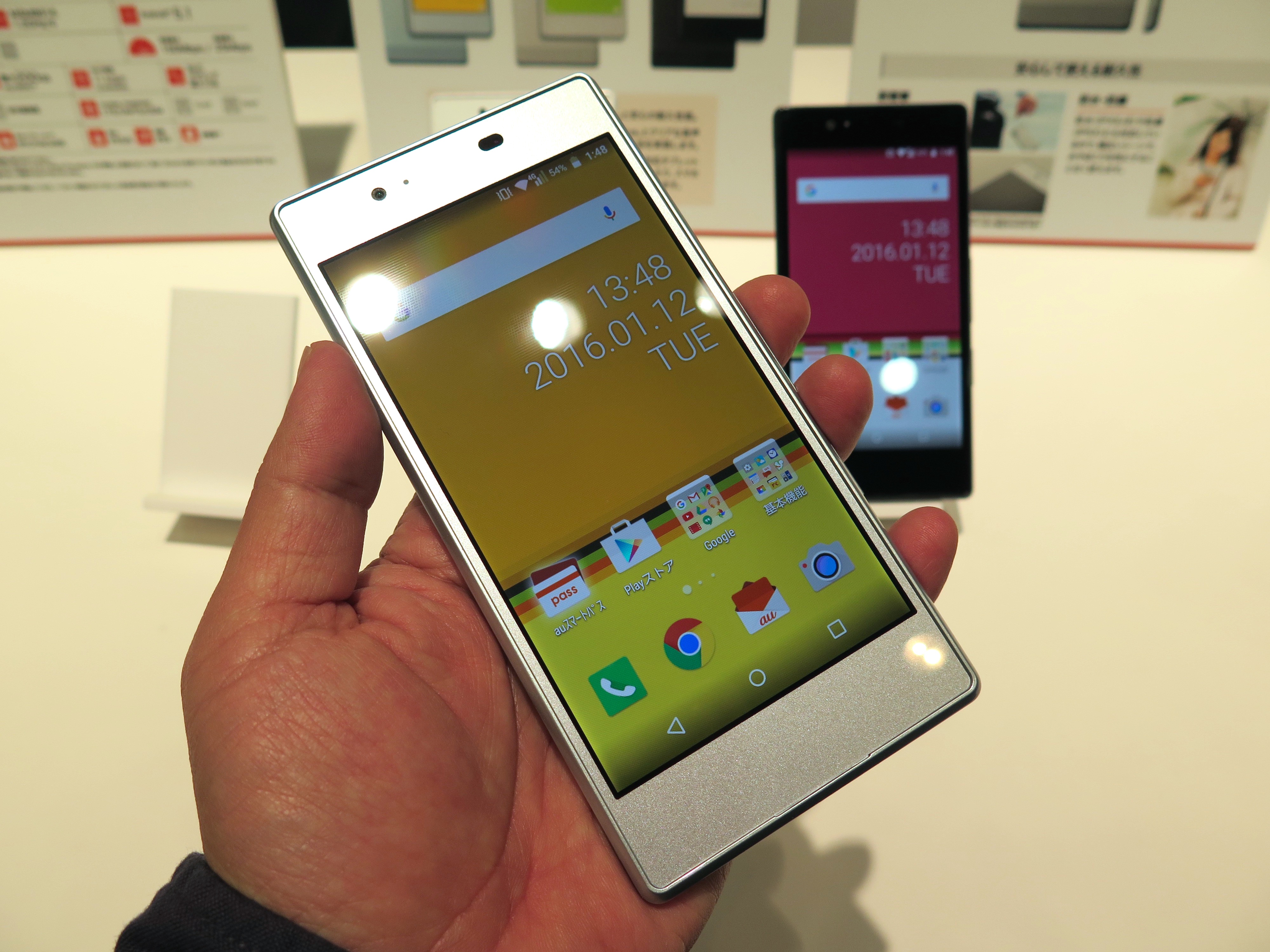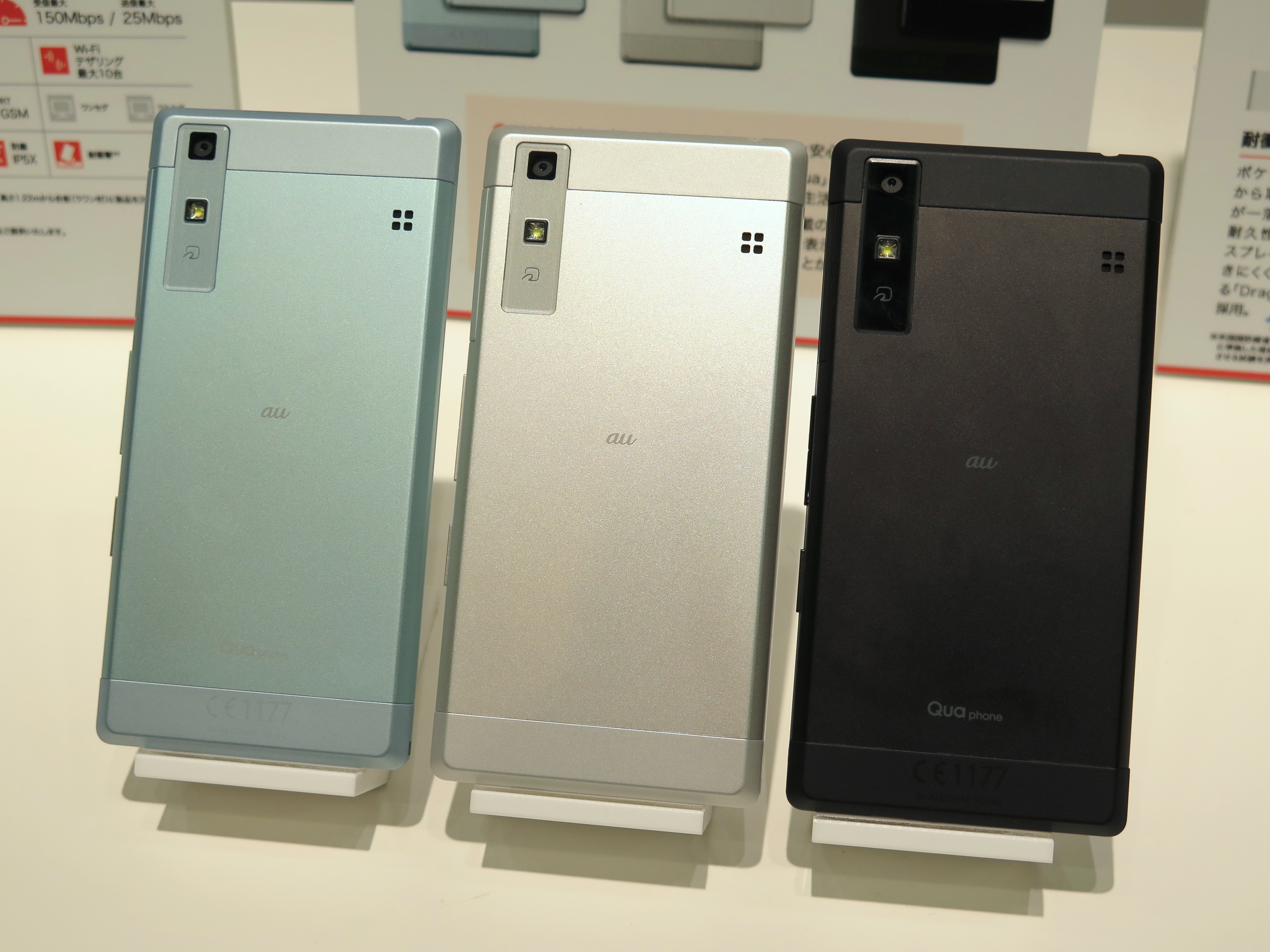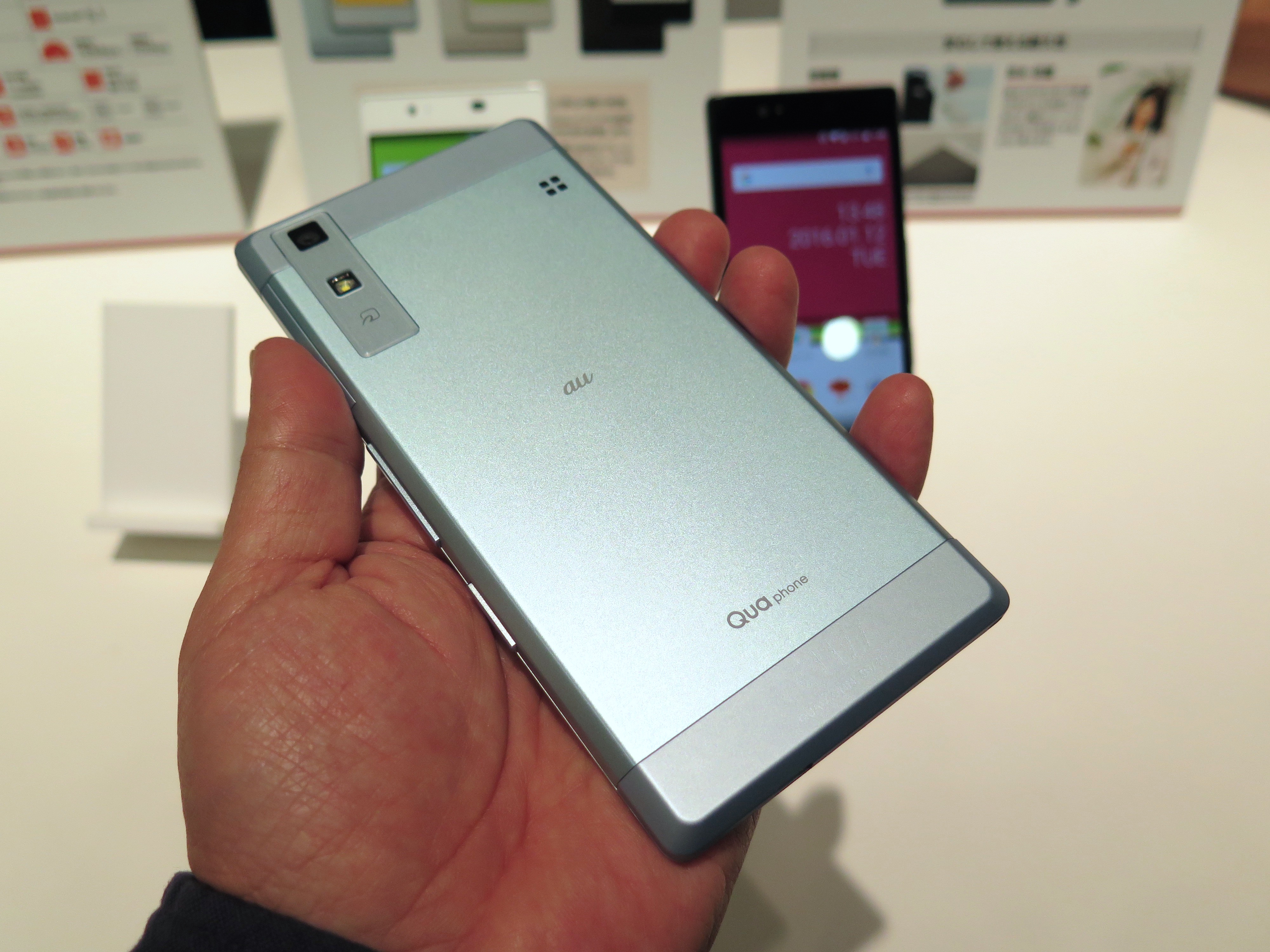 まずは、auのオリジナルブランド「Qua(キュア)」を冠した初のスマホ「Qua Phone」。約5.0インチのHDディスプレイ、1.2GHzのクアッドコアCPUを搭載するミドルレンジモデルです。メタル素材のフラットデザインを採用し、7.9mmという薄さで、やや男性向きとも言える、シャープな印象でした。