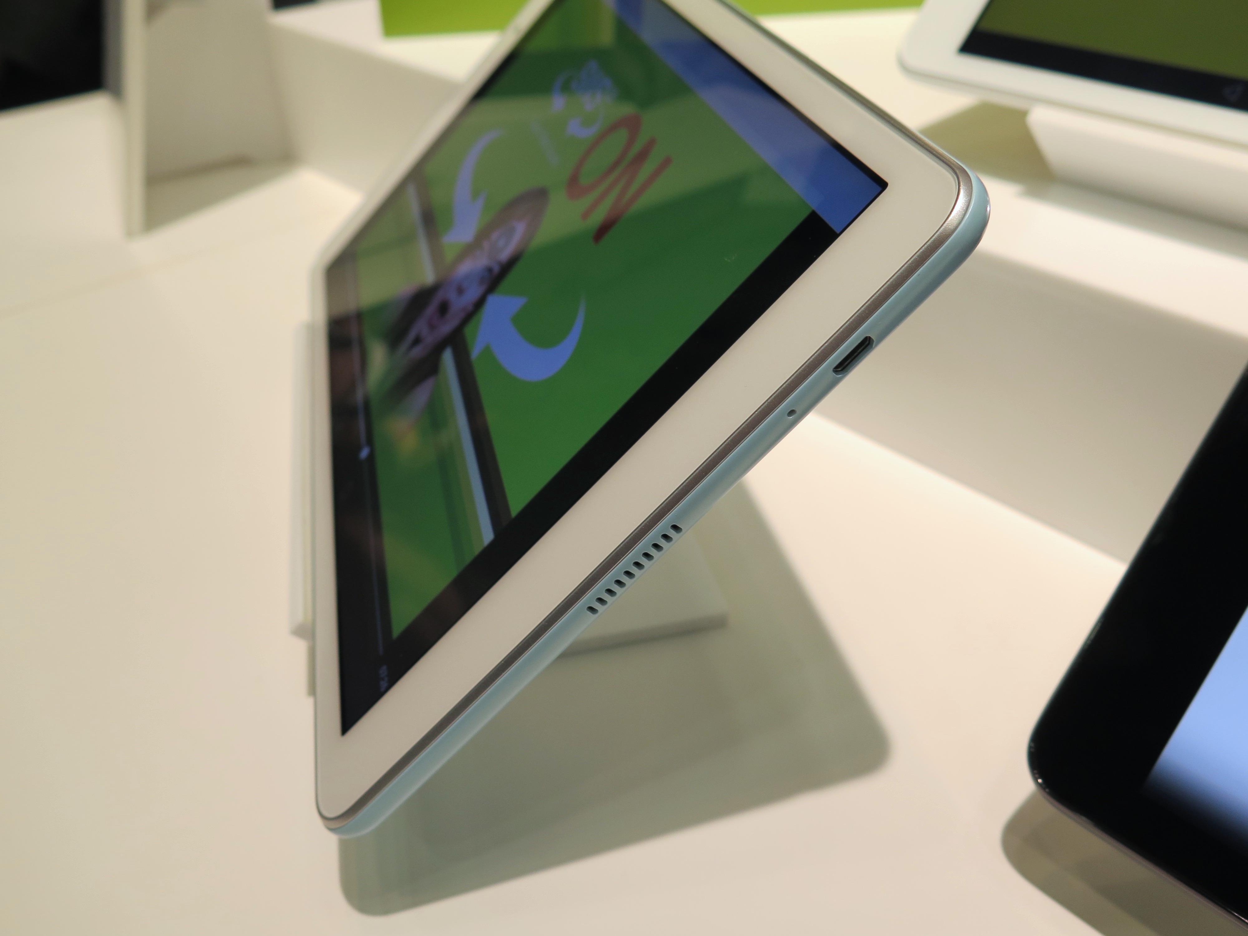 画面解像度はWUXGA(1920×1200ドット)。CPUは1.5GHzの4コアと1.2GHzの4コアを組み合わせたオクタコア、RAMは2GBという、動画やゲームを楽しむにも十分なスペックを備えています。両サイドにステレオスピーカーを搭載していることも特徴です。