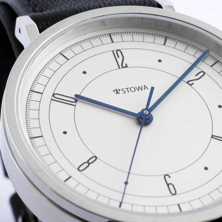 真っ白な文字盤に等間隔に刻まれた端正なライン、その墨色の上で静かに歩を進める3本の青い針が美しい。ドイツ・フォルツハイムの時計ブランド「STOWA(ストーヴァ)」から到着したのは、バウハウス100周年を記念する特別モデル「ANTEA(アンテア)100 jahre BAUHAUS」(18万円/税別)の第2弾。