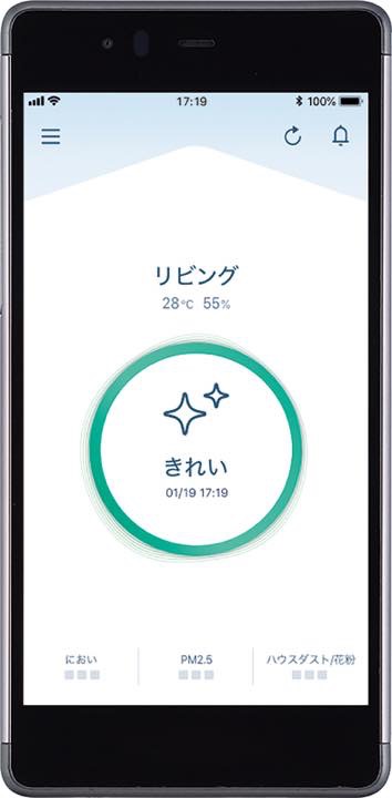 Android OSバージョン6.0以上、iOSバージョン11.1.0以上のスマホに対応した「ミルエア」アプリを使うことによって、現在の部屋の室温、湿度、空気の状態が確認できるほか、1時間ごとのニオイ、PM2.5、ハウスダスト/花粉といった汚れ物質の割合の変化をグラフで確認できます。
