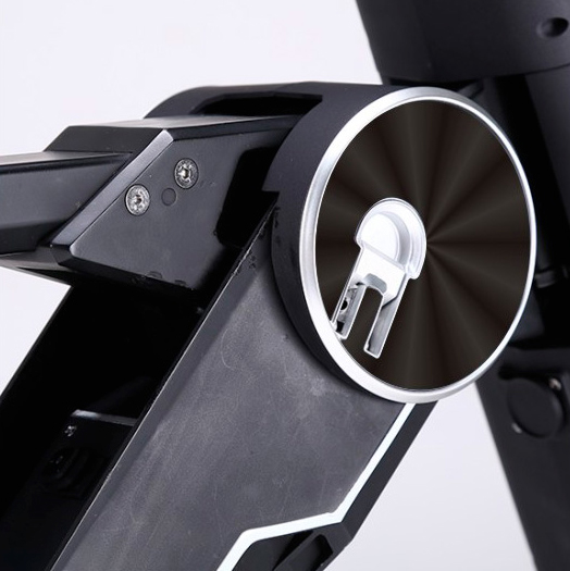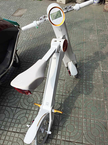 大きさは自転車よりも小さく、折りたたむと全長1235mm。本体は20kgだが、折りたためるから玄関に置いたり、オフィスに十分に運べるサイズ。
