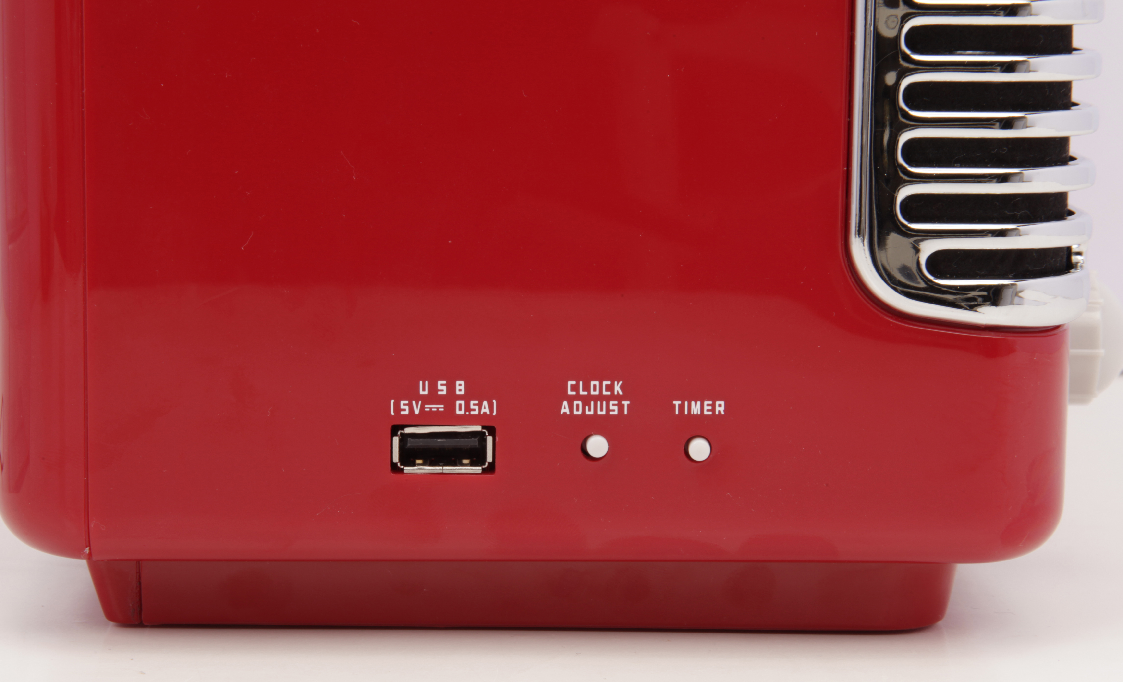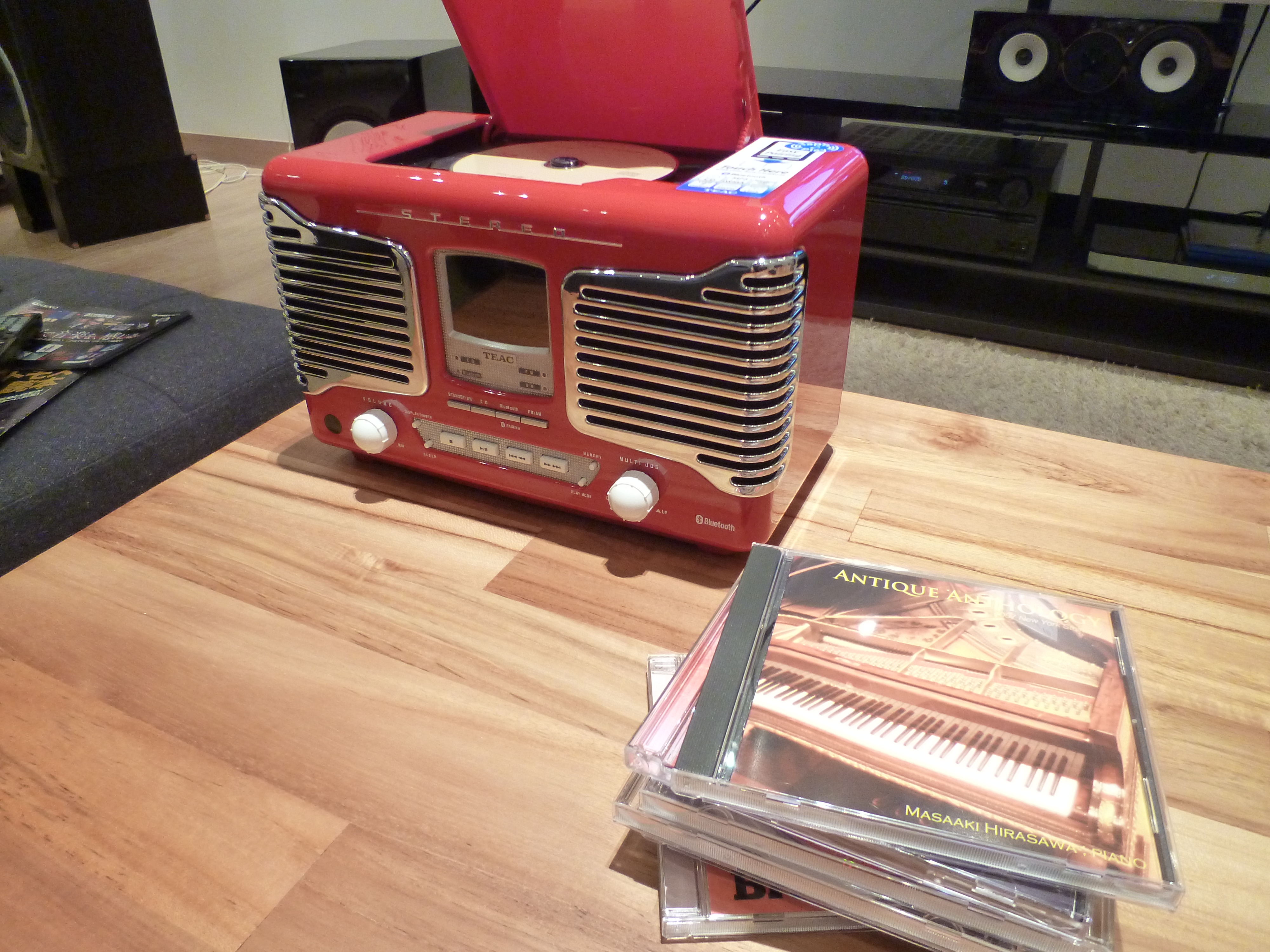 CDプレイヤーは本体上部に備えられており、一般的なCDだけじゃなく、CD-R/RWディスクに記録したMP3やWMAファイルの再生もできる。本体側面には充電用のUSBポートが装備されていて、Bluetooth経由で音楽を聴きながらスマホを充電することも可能。