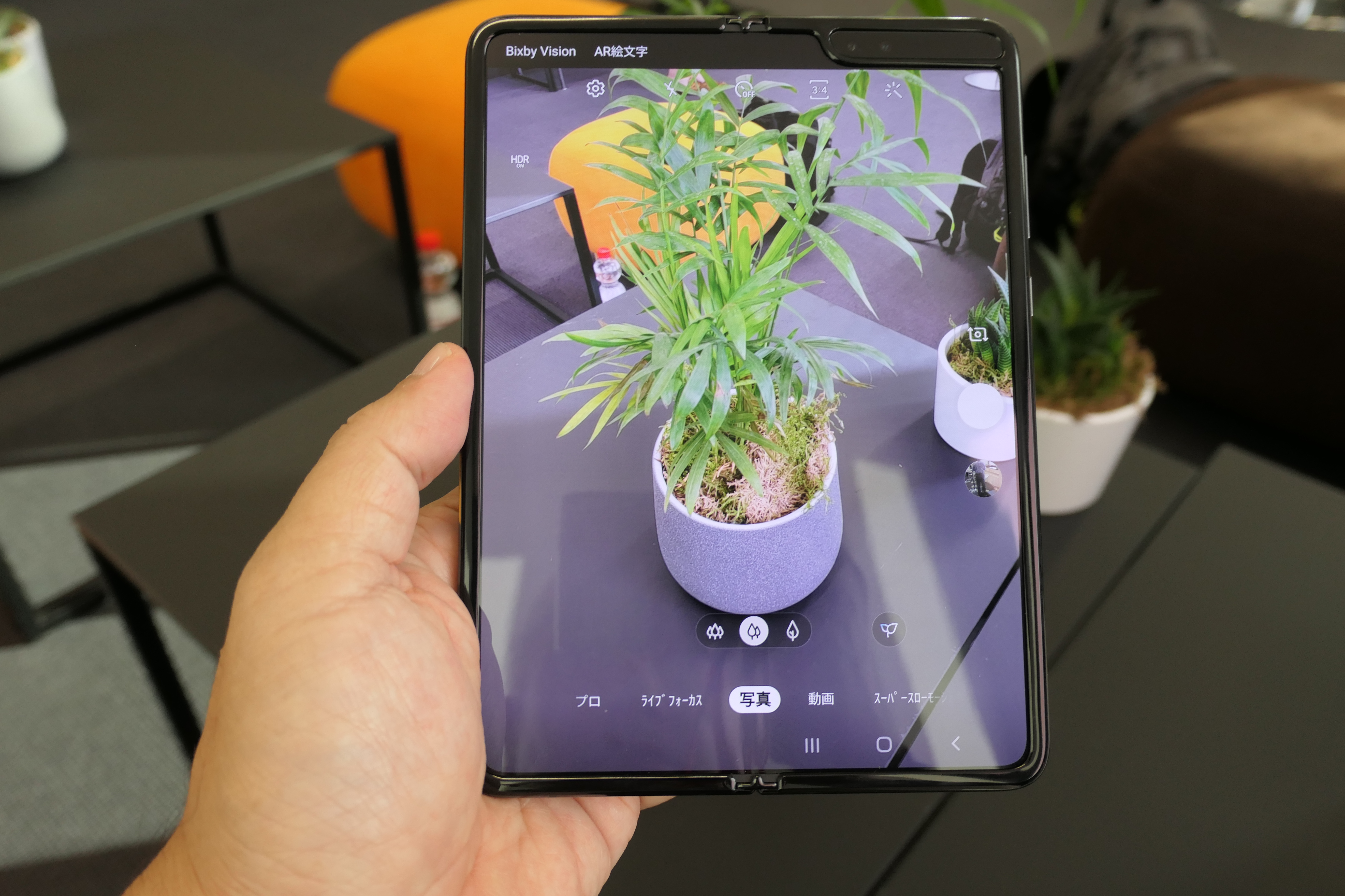 背面に搭載されたメインカメラがトリプルレンズカメラ(広角+望遠+超広角)で、本体を開いた状態でも折り畳んだ状態でも撮影できます。セルフィー用のインカメラは、開いて使うとき用にダブルレンズカメラ(標準+広角)を搭載し、さらに折り畳んだ状態で使えるシングルカメラも備えています。つまり計6個のカメラを搭載していて、どんなスタイルで使う場合にも撮影できる仕様です。