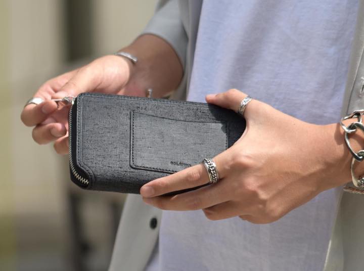 長財布タイプの「ラウンドウォレット」(2万1000円/税別)は、ファスナーによって3辺が大きく開くつくり。内部には、札などを入れられるフリースペースやジップ付きの小銭入れ、そして両面にはカード入れを備えていて、収納力バツグンです。