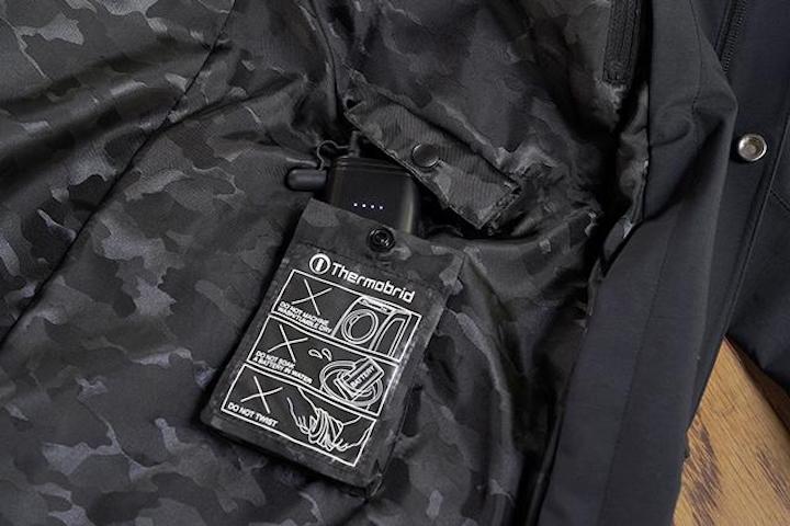 “サーモブリッド”とは、ライナーの背面にマイクロカーボンファイバーを配置し、このファイバーを内部に仕込んだバッテリーを使って温める、つまりコート内側を直接保温するという画期的なもの。暖かさはボタン操作により3段階で調節可能、つまり中に着込んだ衣類の脱ぎ着ではなく、ボタン操作で暖かさを調整することも可能ということです。