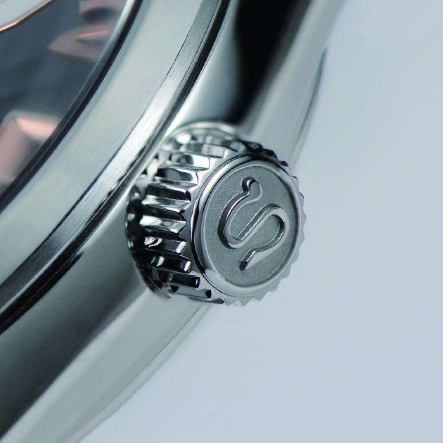 このたび発売された60周年限定モデルは、そんな歴史ある「オートマチック」初代モデルへのオマージュを込めて作られた一本。初代モデルが誕生したころは、ダイヤルに記されるブランドロゴや頭文字には様々な書体が使用されていたが、中でも特徴的で今でも愛される通称「蛇S(ヘビエス)」と呼ばれるノスタルジックなSマークを限定モデルのりゅうずに表現。
