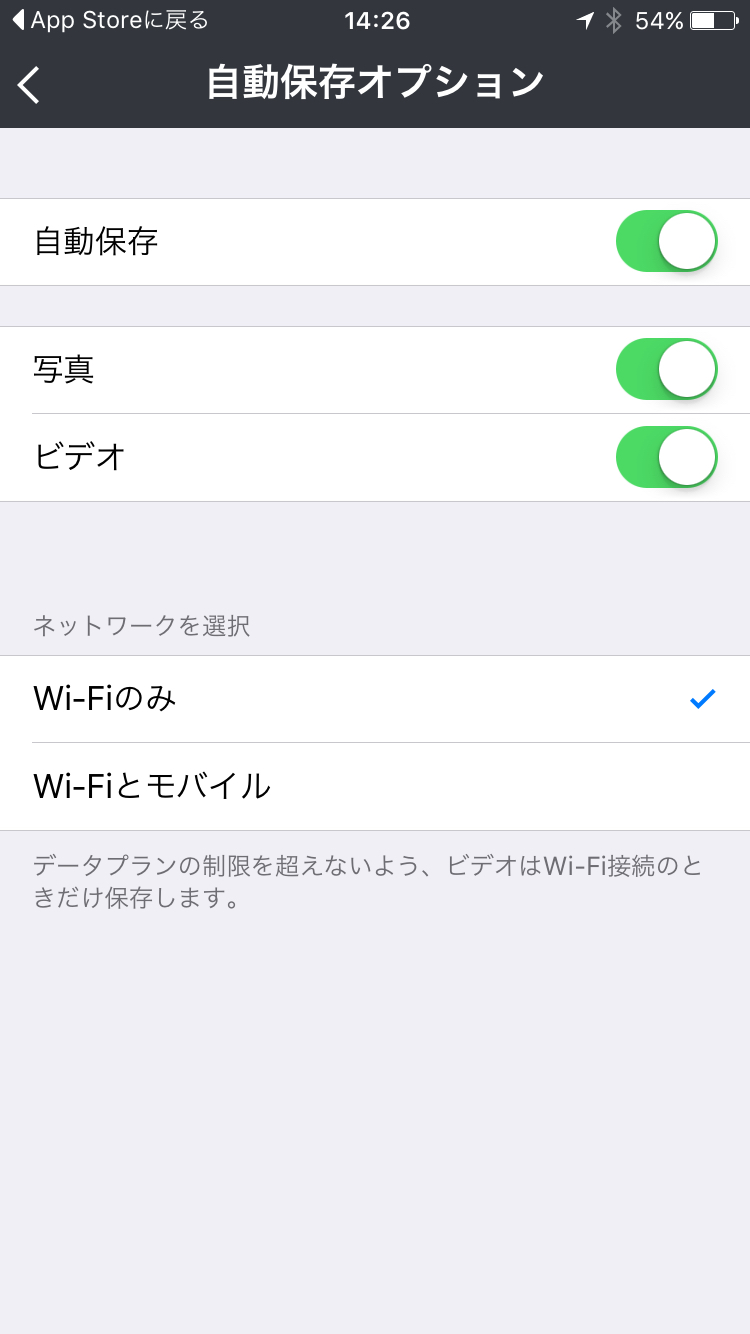 自動保存オンで次々にアップロード。Wi-Fi環境でのみ動作するよう設定できる