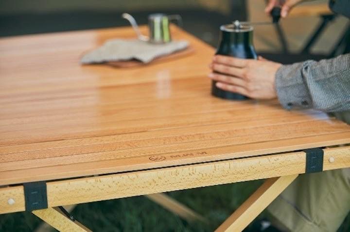 天然木を使った美しい木目の「READY TABLE」は、ロール式の天板は丸めて、組み立て式のフレームは折り畳んでコンパクトに収納でき、組み立ても簡単。完成時の高さは45cmとロースタイルにも最適な高さです。