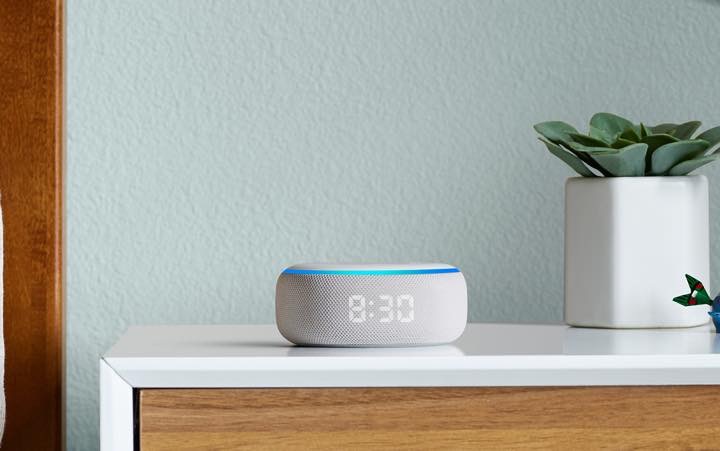 Echoシリーズで最も人気がある「Echo Dot」の最新モデル「Echo Dot with clock」は、全面にLED時計を搭載。寝室のサイドテーブルやキッチンカウンターなどでの利用に最適な仕様に。LEDの明るさは部屋の明暗に応じてセンサーが自動で調整を行い、時刻表示以外にも天気&外気温、タイマー設定、目覚まし機能、スヌーズ機能付きのアラームを搭載。