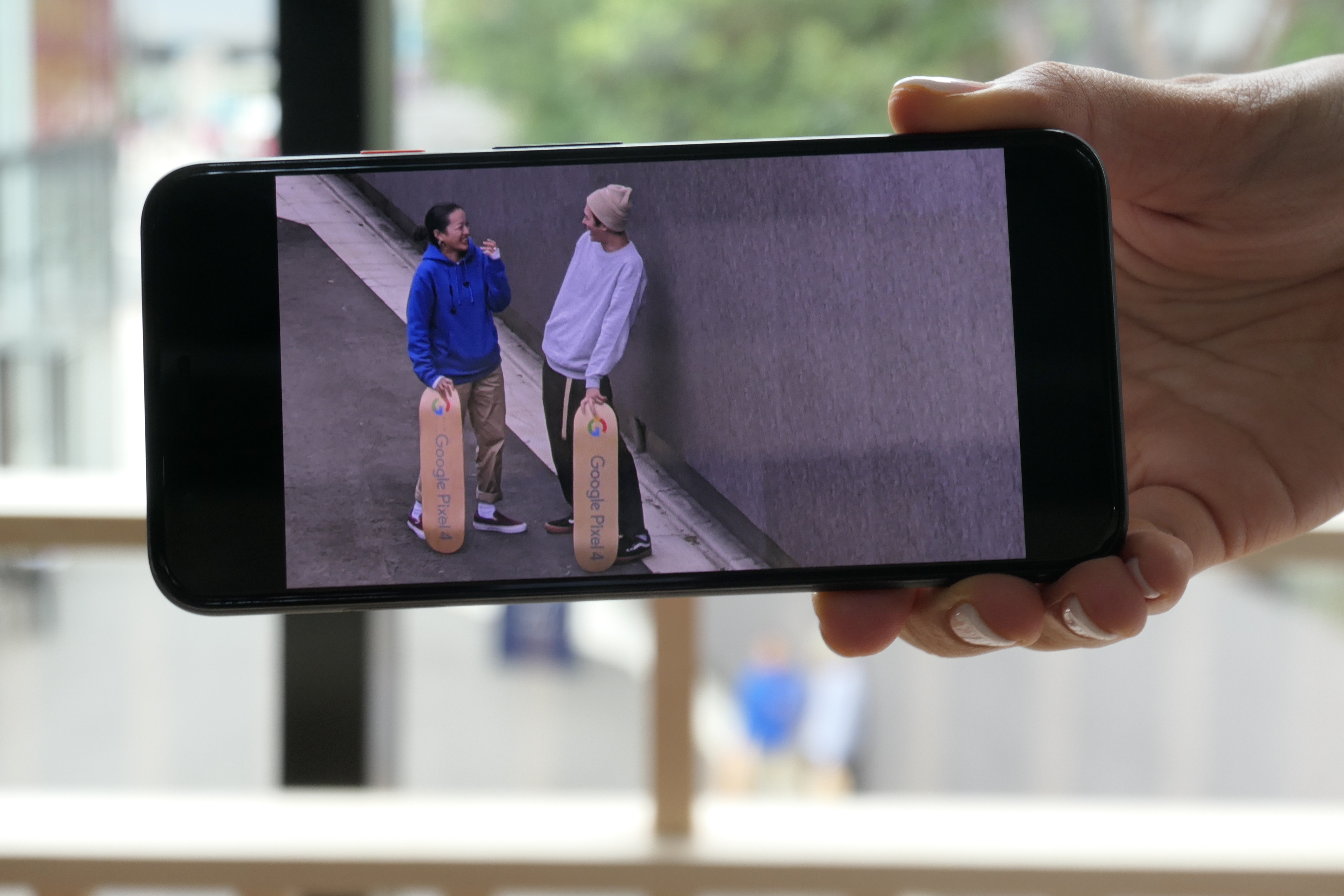 ▲離れた場所にいる人物を8倍ズームで撮影した写真。スケートボードの「Google Pixel 4」という文字もくっきり写っている