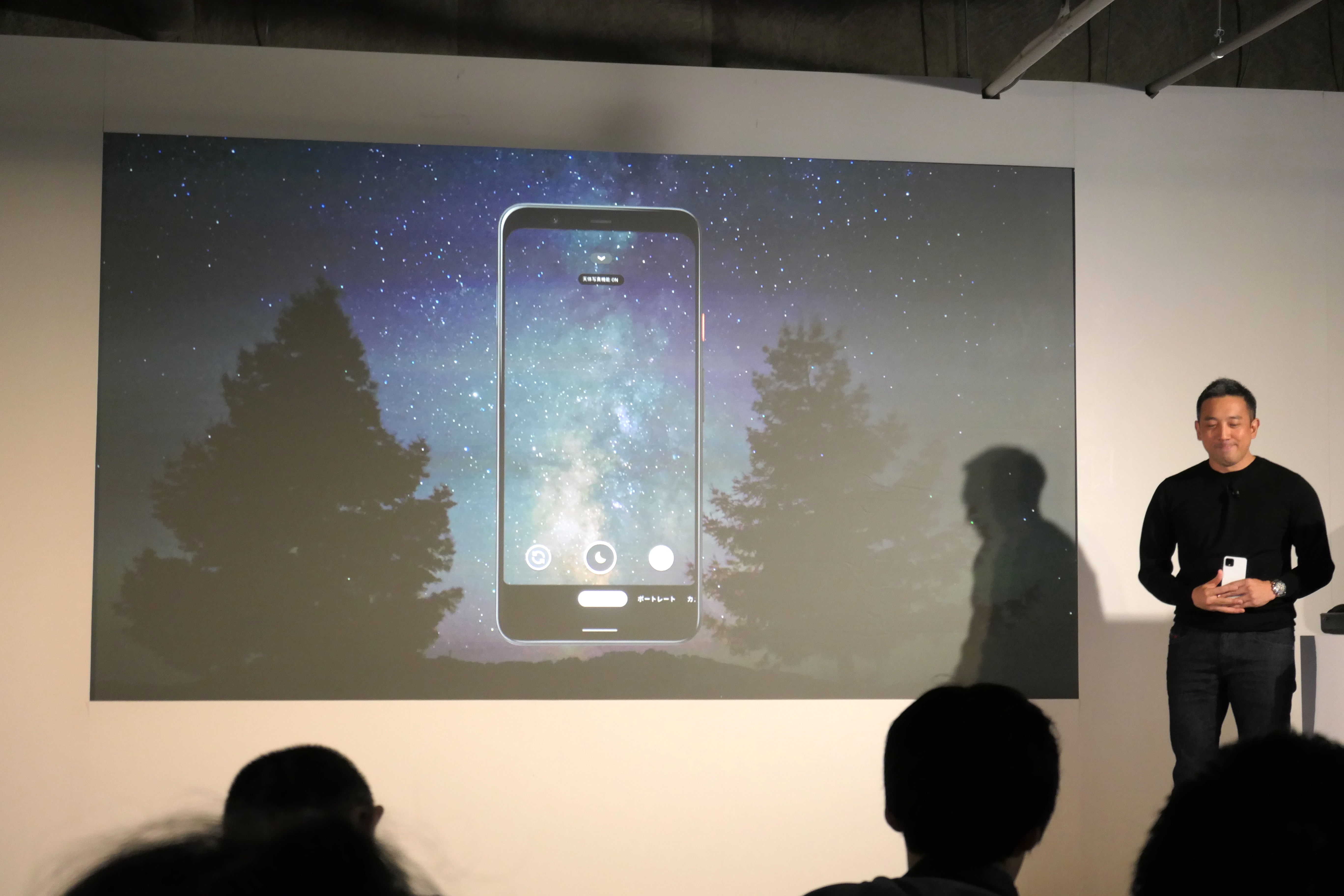 Pixel 3で注目された夜景モードは、星空も撮影できるように進化。とはいえ、さすがに手持ちでは撮影できませんが、三脚がなくても、Pixel 4を安定した場所に置けばOKとのこと。夜景モードに設定して、シャッターを押すだけで、長時間露光となり、一般的なデジカメでも難しい天体写真が撮れるそうです。