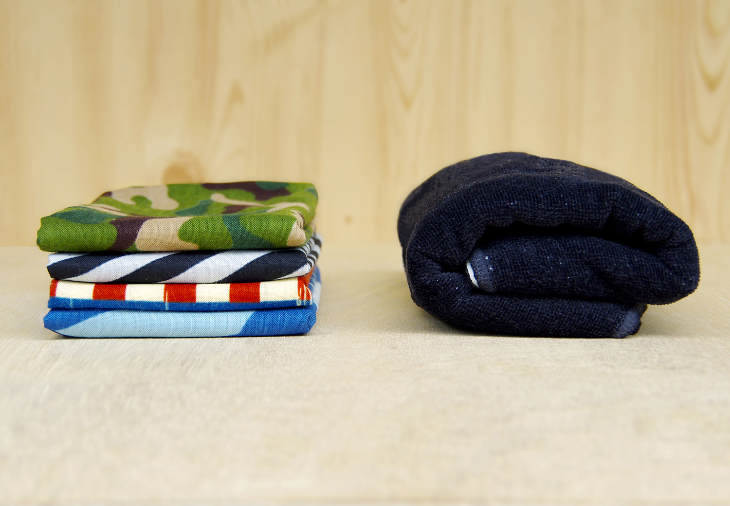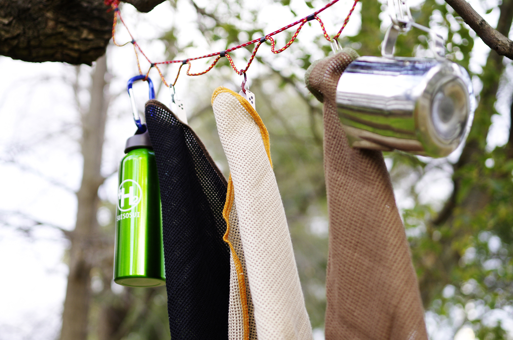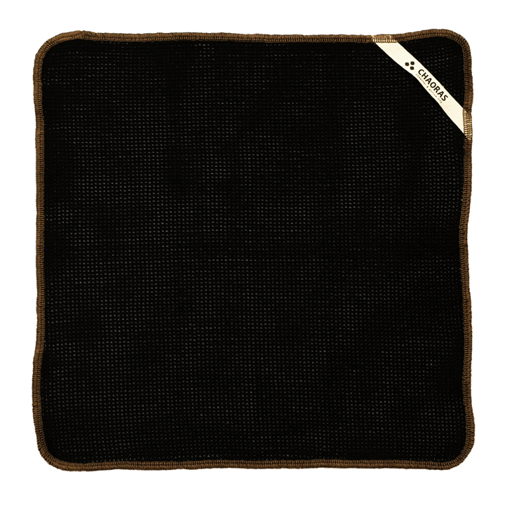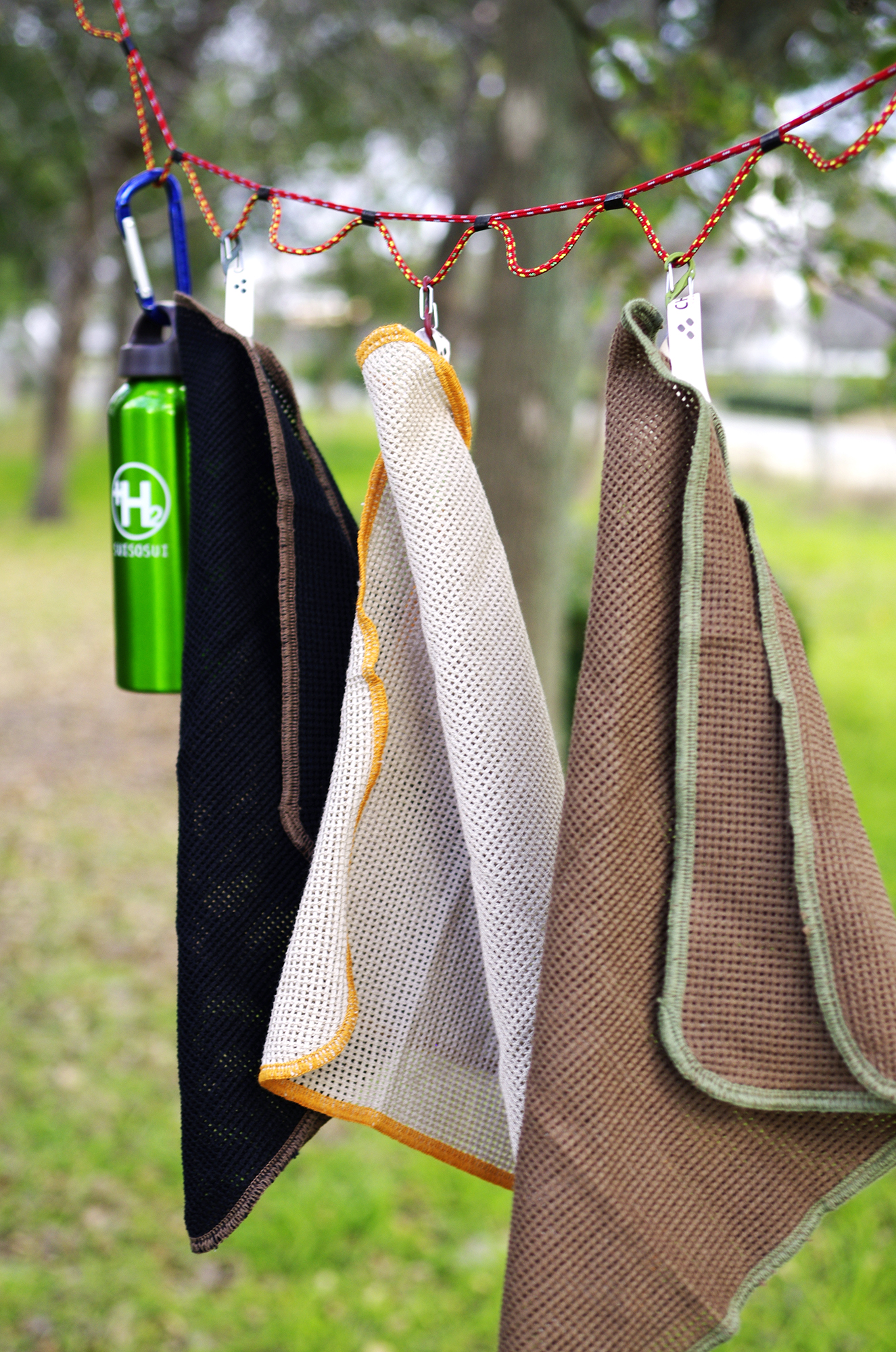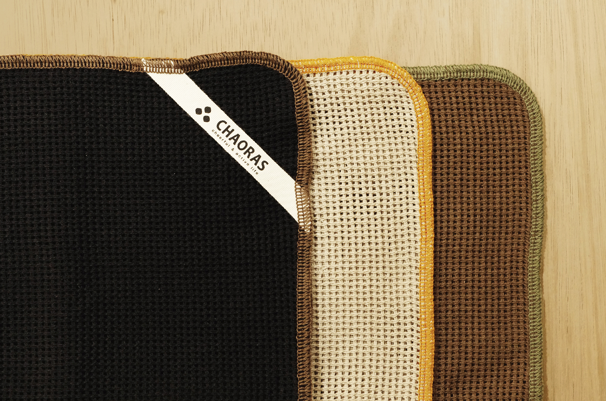 ブラック、ブラウン、ベージュの3枚セットの「CAMP CLOTH」。丈夫で扱いやすい綿100%で、ループ状のタグがついているから、フックやカラビナに引っ掛けやすいんです。