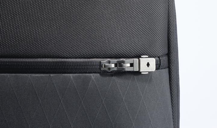 さらに、簡易ロック機能が付いたファスナーを採用。引手を重ねて押しこむことで簡易ロックがかかり、上下のつまみを押すとロックが外れる仕様で、さらにより安全性を高めたい場合は付属の鍵をかけられます。