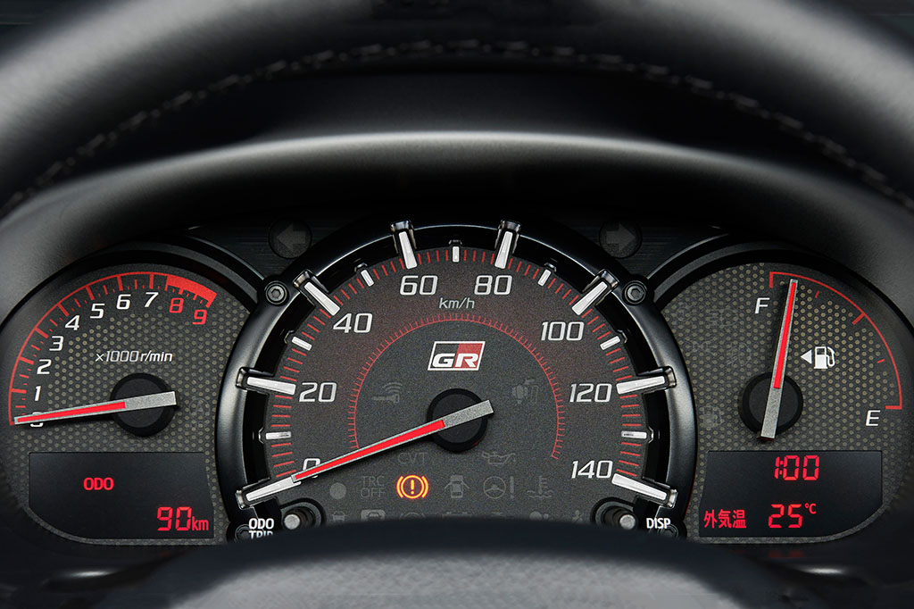 GRのエンブレムが光るMOMO製革巻きステアリングホイールも専用品で、その奥には、赤い針が数値を刻む、専用の自発光式3眼メーターが広がります。その上で、センタークラスターやドアグリップがピアノブラック調にまとめられ、大人っぽい雰囲気に仕立てられています。