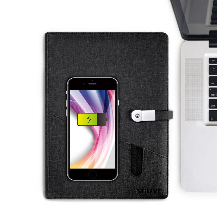 というわけで紹介したいのが、ワイヤレス充電器とモバイルバッテリーを内蔵したソウイジャパン「充電ノート SY-106」(1万6800円)。スマホを重ねて置いておくだけで、スマートに充電できるアイテムです。