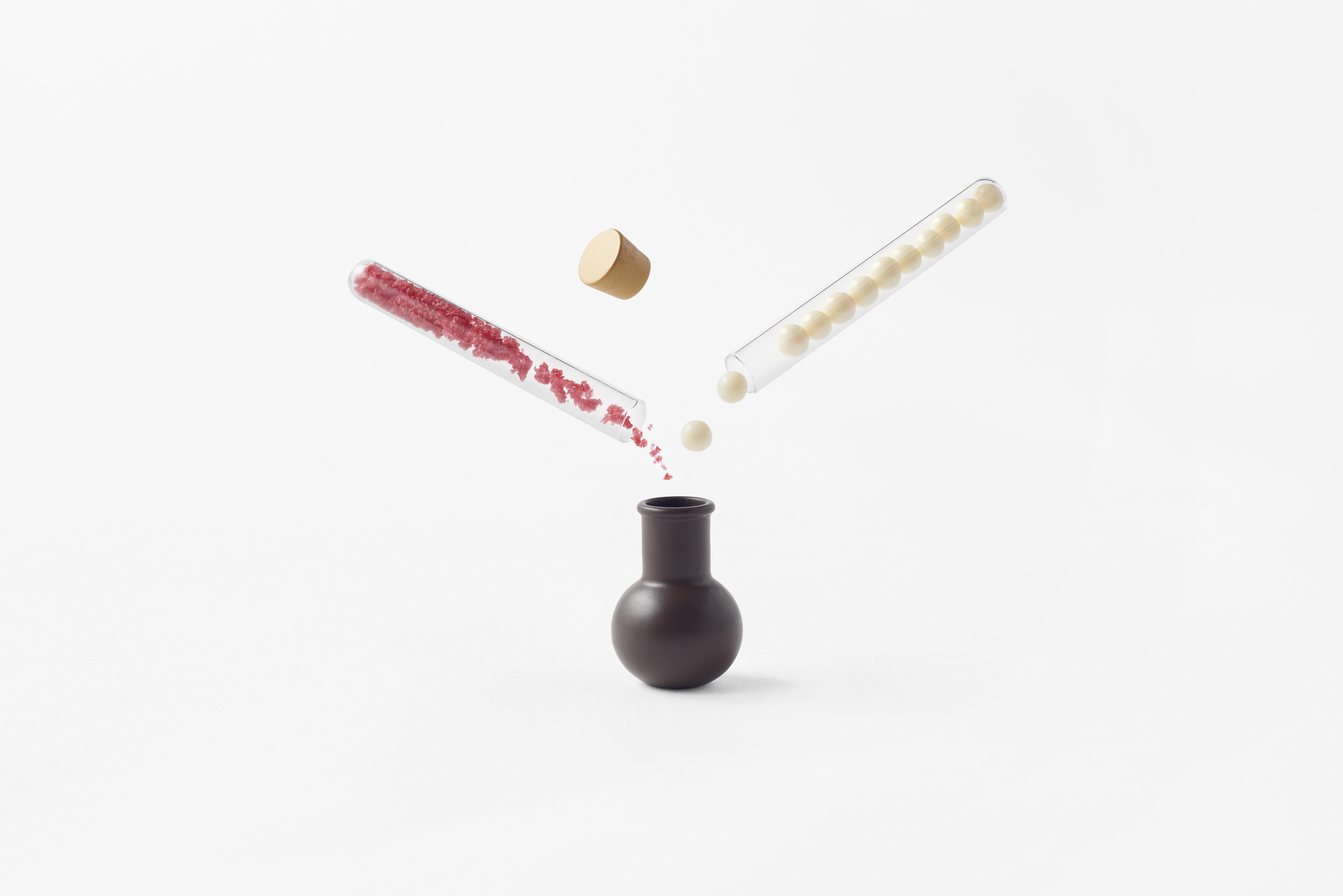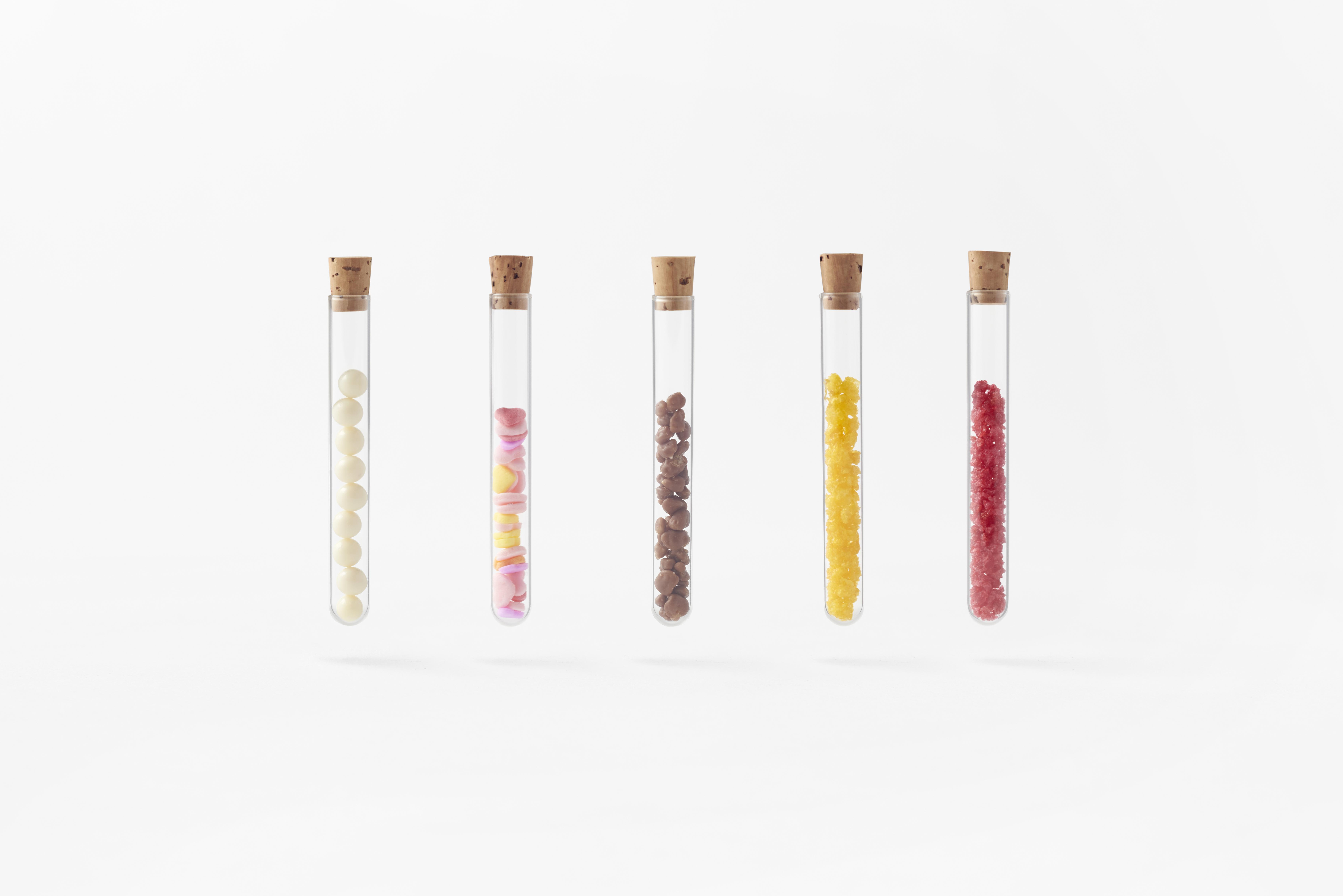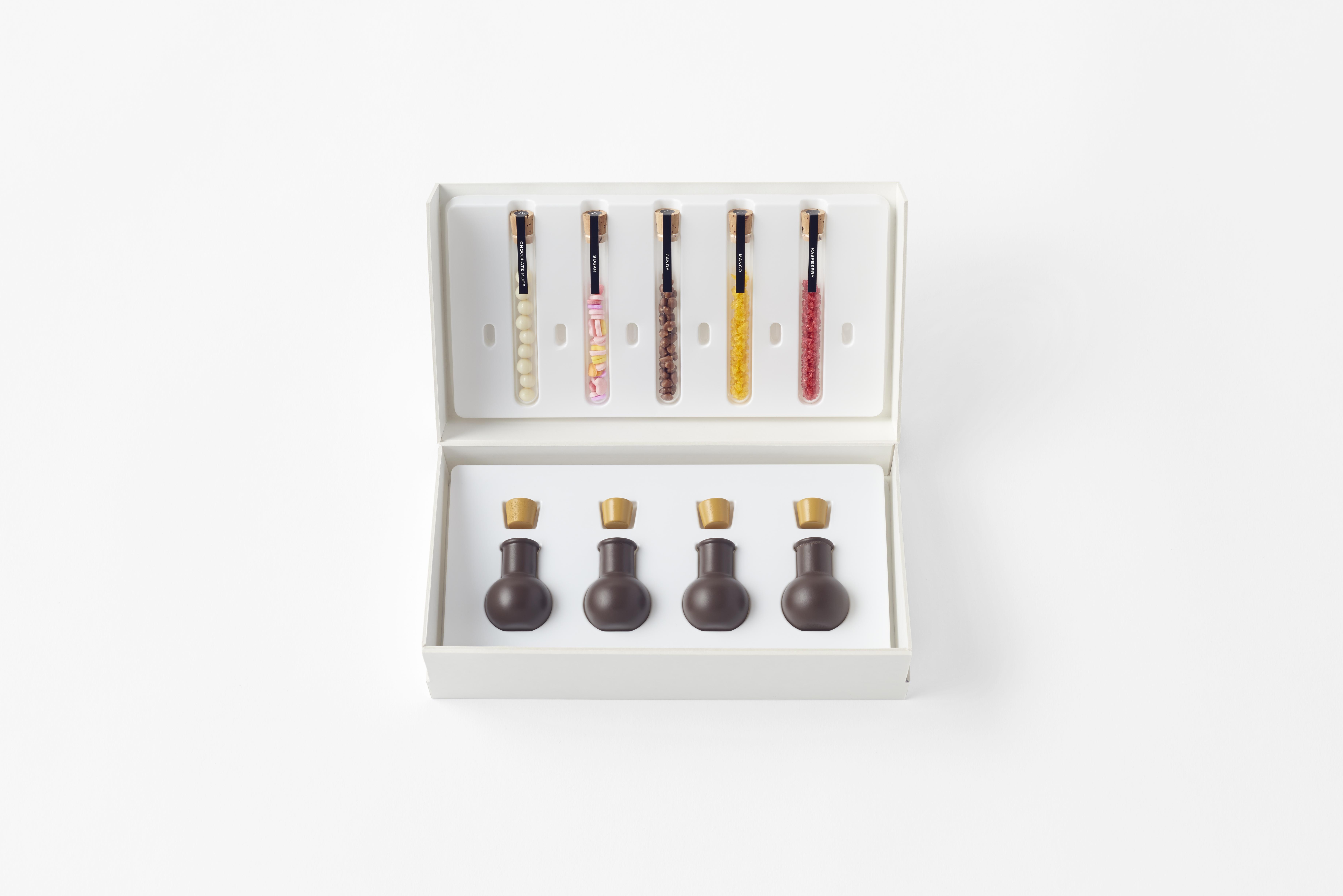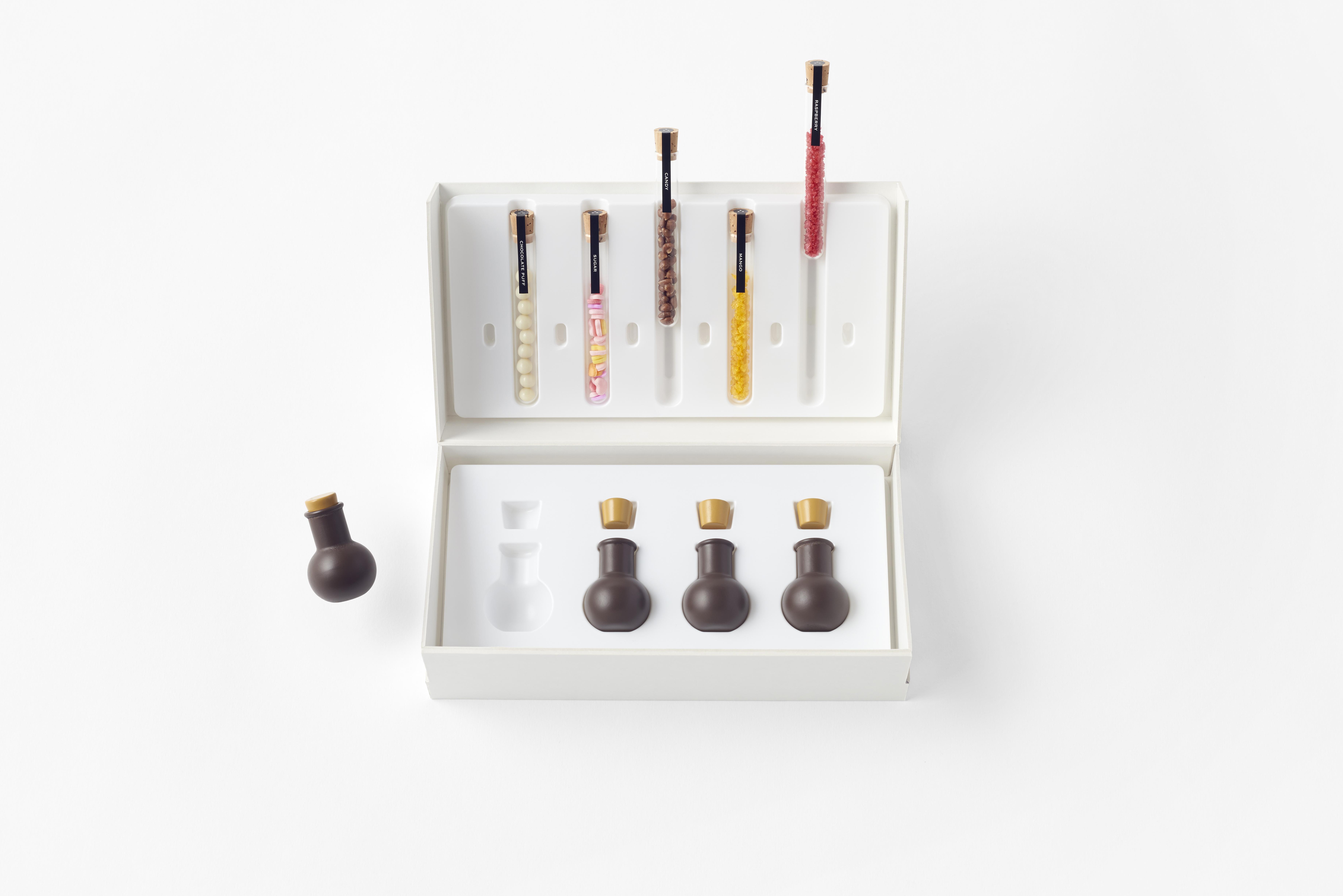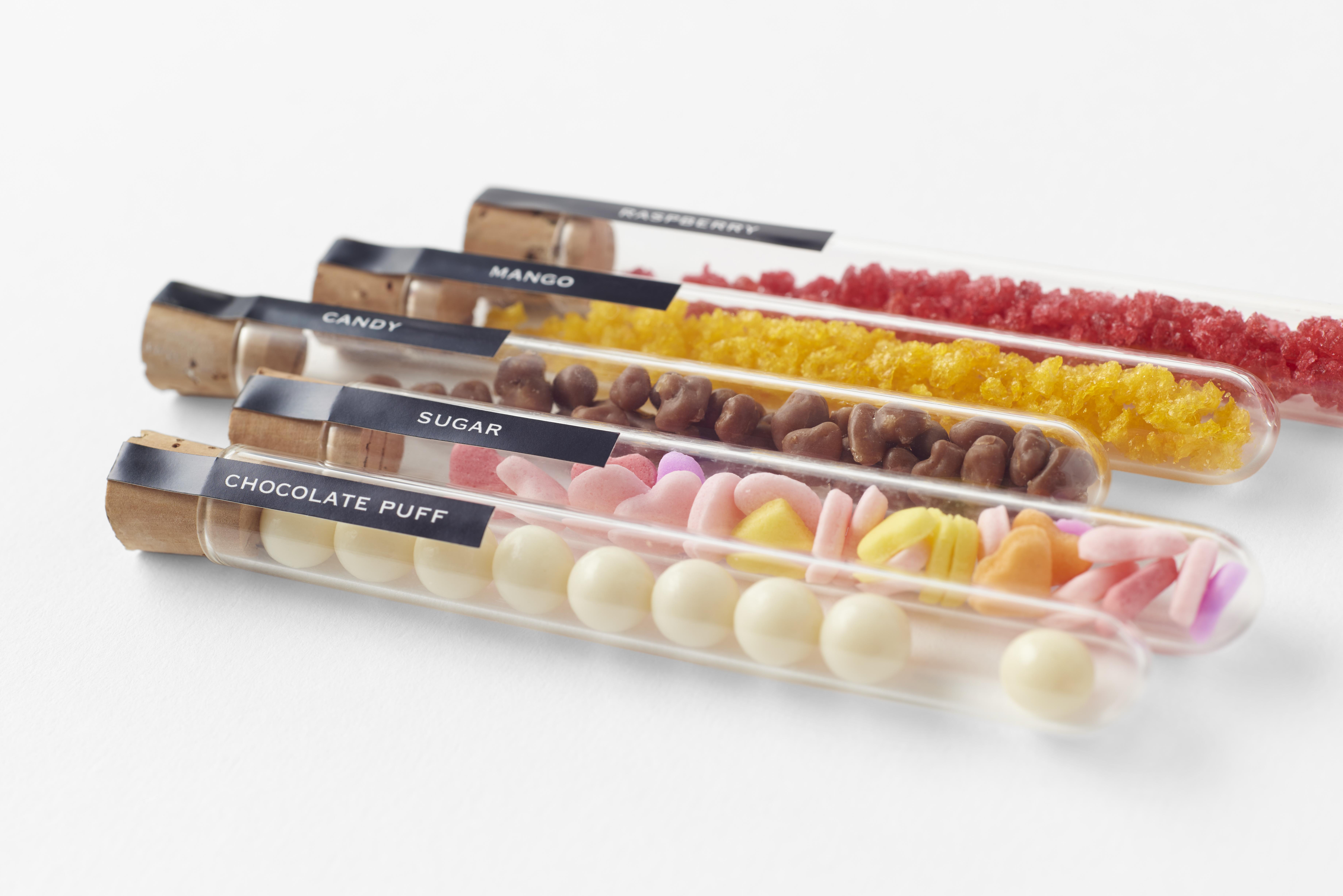 試験管に入ったチョコレートパフ、シュガー、キャンディ、マンゴー顆粒、ラズベリー顆粒の5種類のフレーバーを好みでこのフラスコの中に流し込んでミックス、自分だけのテイストを作り出すというアイテムなのです。