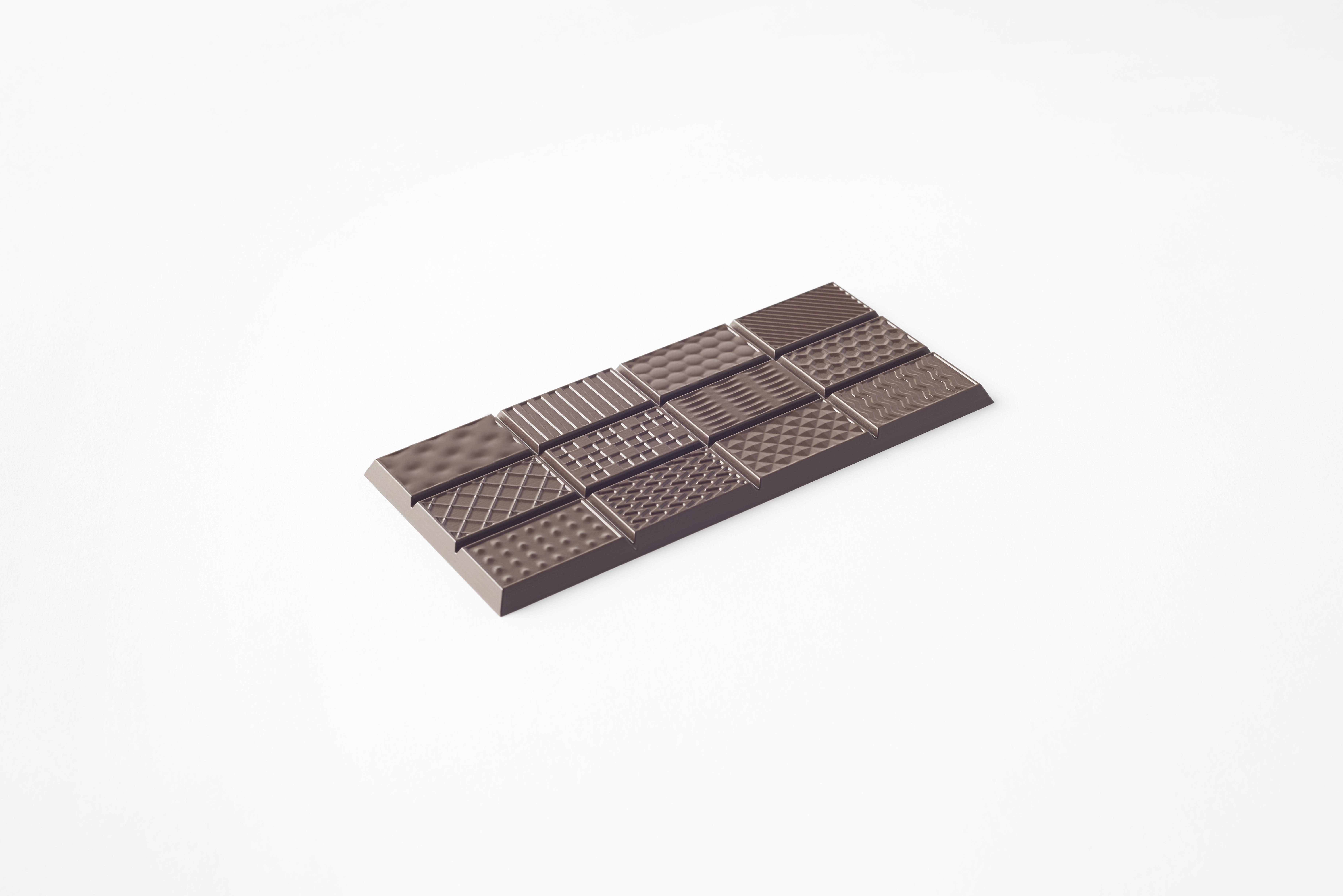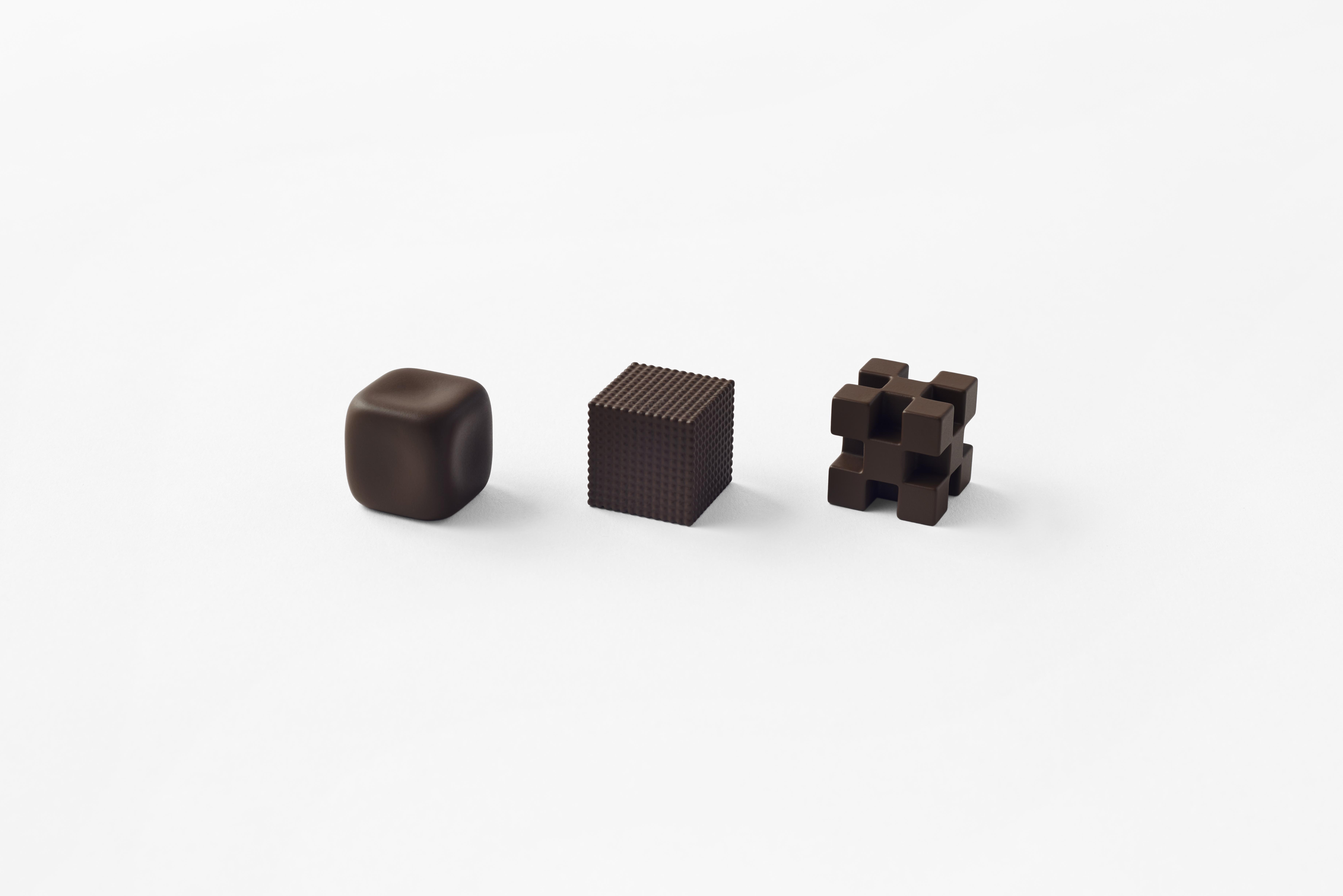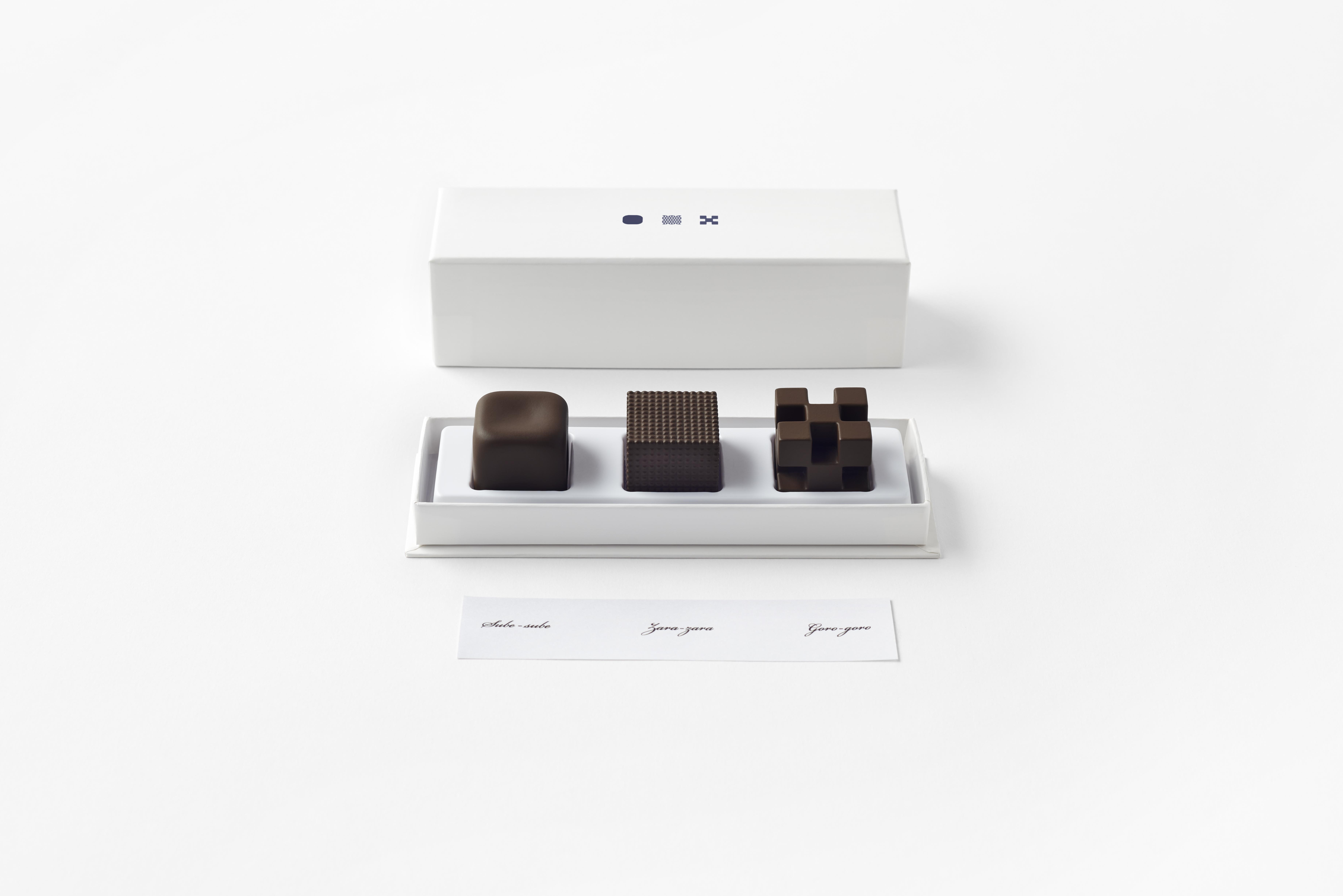 「ショコラテクスチャ」は、同じ味のチョコレートの形のみを変化させた3つの立体型チョコ。食感が異なることによって、味も変化するという体験を楽しめるアイテムです。