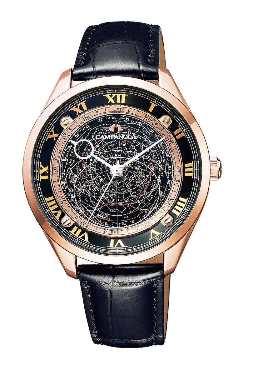 2000年のデビュー以来、「時を愉しむ、日常を愉しむ、個性を愉しむ」をテーマに掲げ、先端技術や匠の技を活かした独創的なモデルを発表してきたカンパノラ。「コスモサイン」は、時の起源でもある天体の運行を、精巧にレイアウトした星座盤を文字盤に表示し、星空の動きを腕元で再現してくれます。