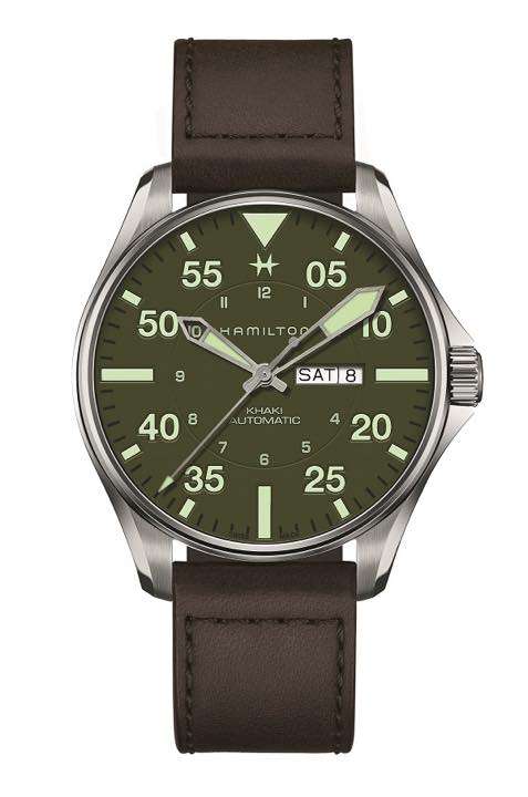 デザイン面に目を向ければ、カーキグリーンのダイヤルにスーパールミノバ加工を施したインデックス、さらに大きな時分針を大胆にデザイン。空の旅に便利なデイデイト表示も備えます。