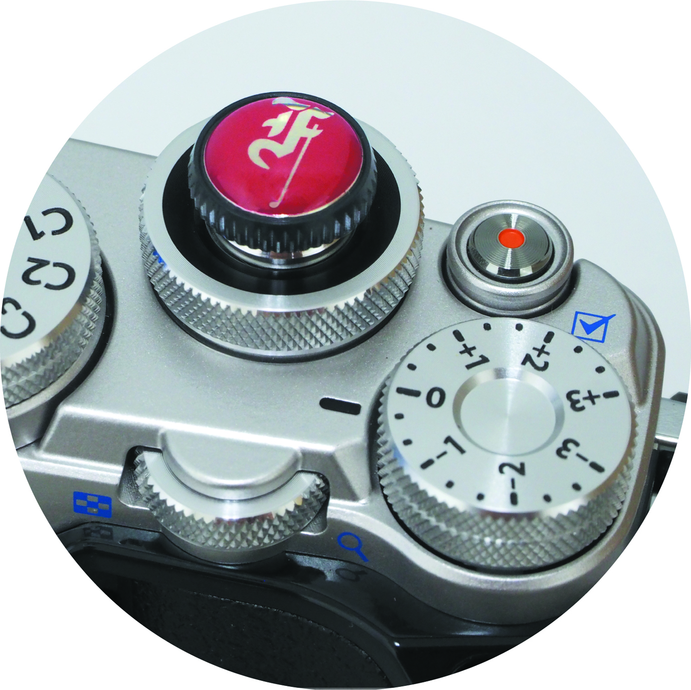かつてのPEN-Fに用いられていた「F」の花文字(飾り文字)があしらわれたレリーズボタン。レッドとブラックのセットでもらえる