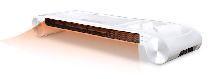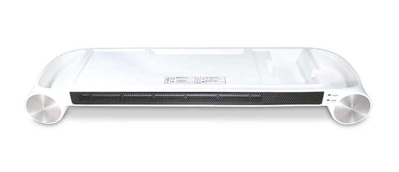 卓上で使いやすいという秘密は、その形状。PCモニターを載せられるようなフラットトップ。その下部から温風が手もとに吹いてくるわけです。