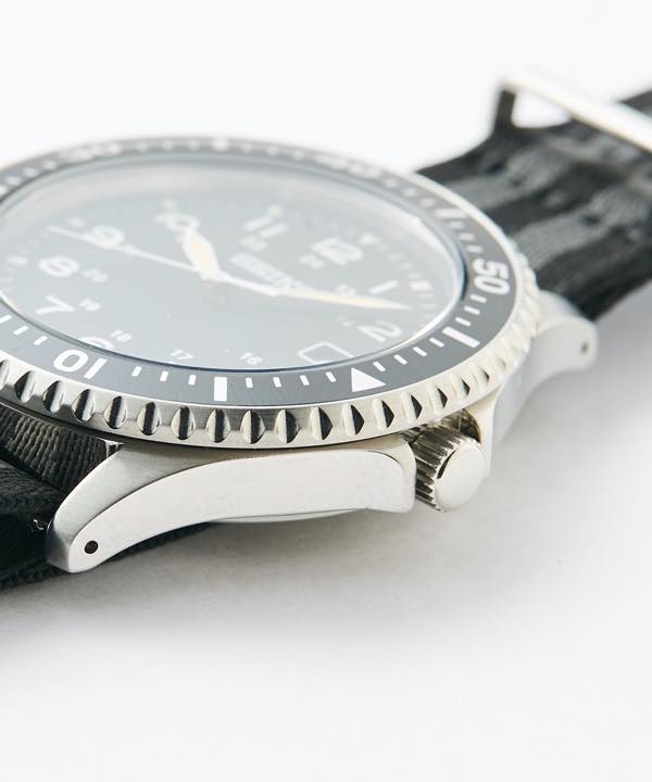 1960〜1970年代のヴィンテージウォッチをアイデアベースにした「別注セイコー×ナノ・ユニバース フィールドヴィンテージ」の最大の特徴は、やはり目を引くストライプのナイロン製バンド。