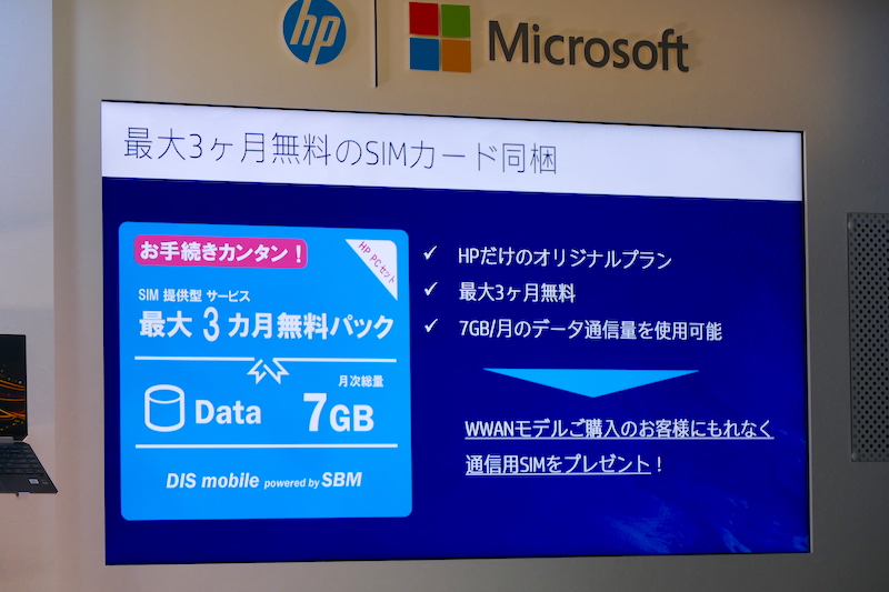 ▲WWANモデルは、最大3ヶ月無料で利用できるSIMカード(7GB /月)を同梱