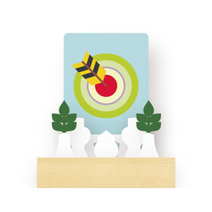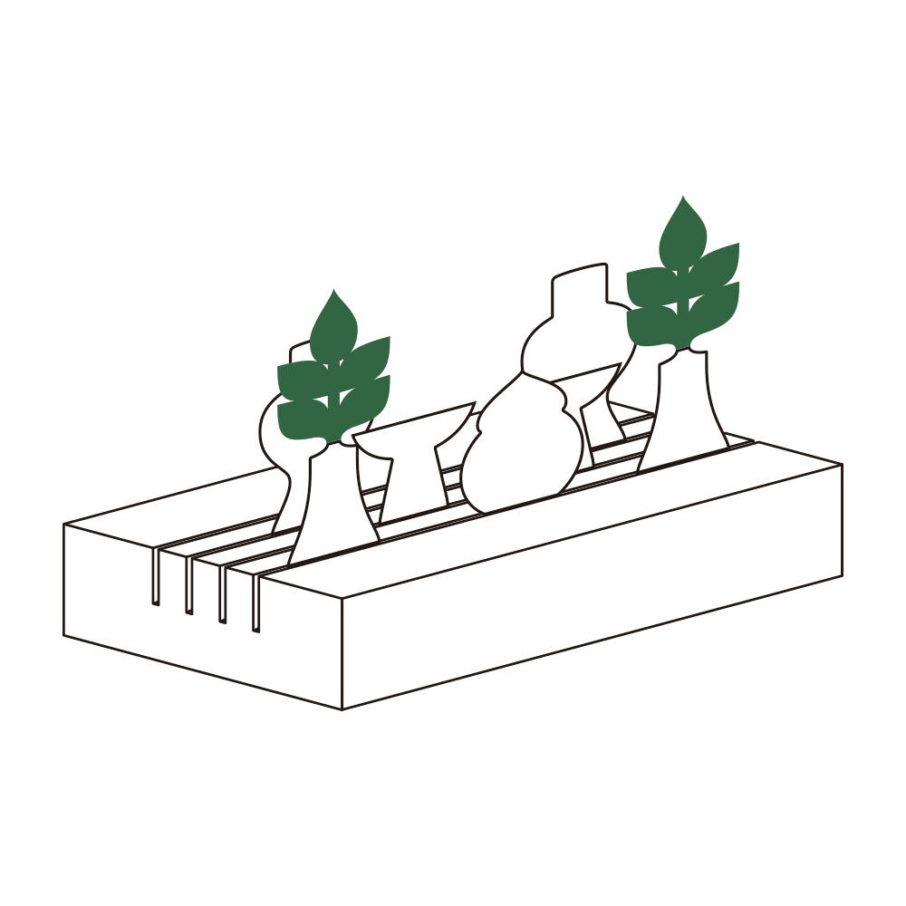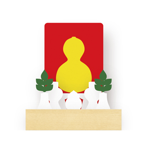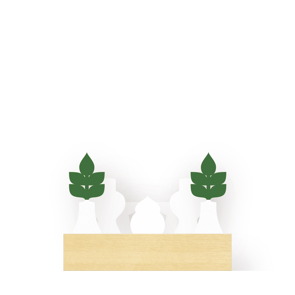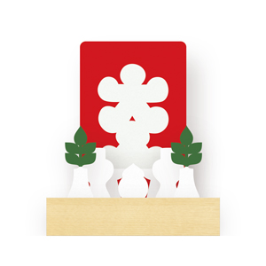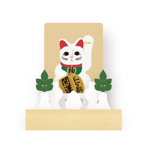 従来陶器製であった神具(水玉・瓶子・高月・榊立て)を、紙製にしたことで小型化、軽量化を実現している。40g、幅9cm×奥行5cmという名刺サイズは驚異的!