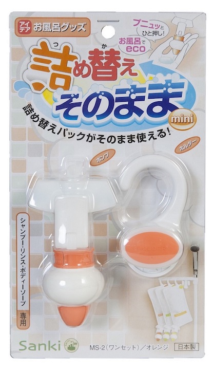 シャンプーなどの詰め替えパックに専用キャップを差し込み、浴室に吊るすだけで、そのまま使える「詰め替えそのまま」のオプション品として、「詰め替えそのまま専用カバー」(3枚セット1650円)が発売されました。