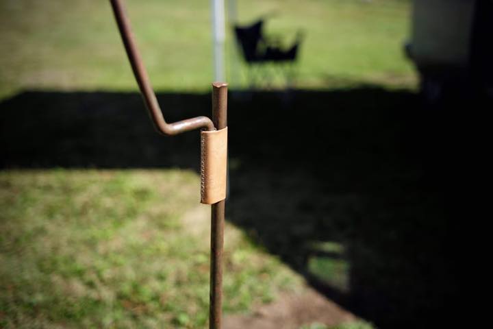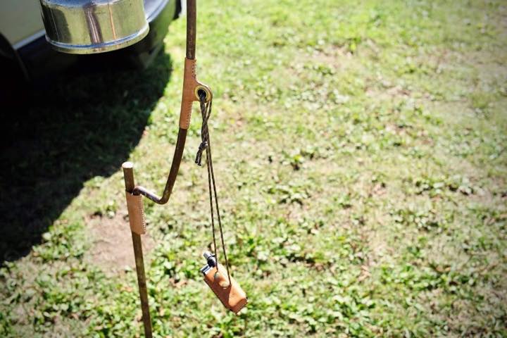 レザー部分のギミックも、職人によりヌメ革が縫い付けられています。杭とハンガー連結部にはレザーのバンドが施されており、デザイン性だけでなく、作業時のグリップ力向上や、真冬時などでのアイアンの冷たさの緩和など、実用性も兼ね備えています。