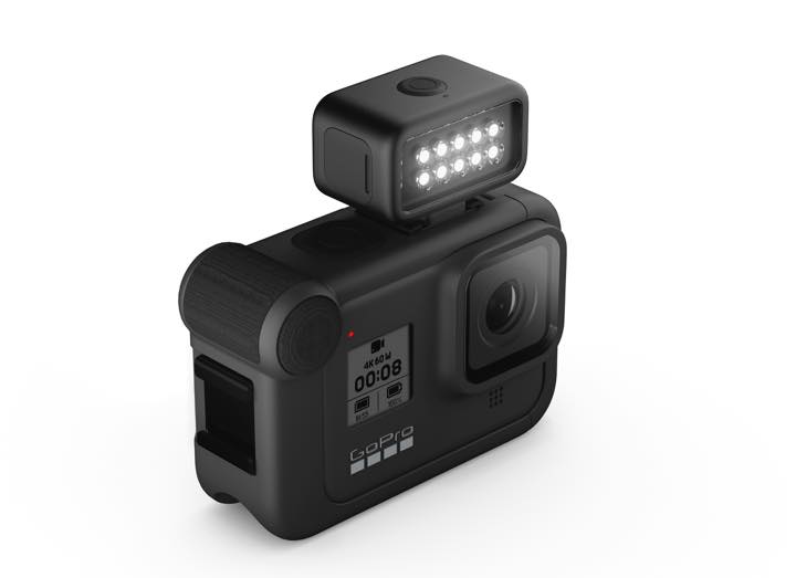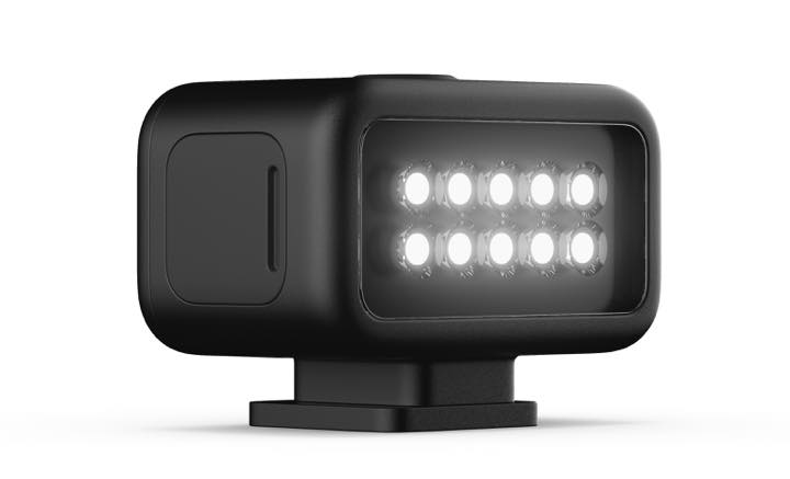 「ライト モジュラー」は防水仕様で、GoProのマウントに取り付けられるスタンドアローン型のLEDライトです。光量を4段階から選択できるほか、ストロボモードも搭載。さらに同梱するライトディフューザーを装着すれば影の発生を防ぎ、より美しいライティングを実現します。