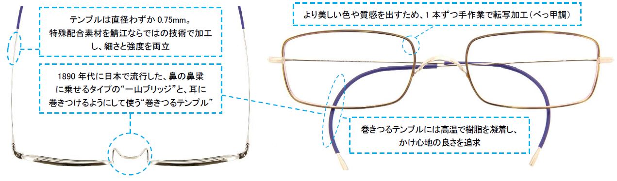 テンプル(”つる”のこと)は、直径約0.75mmという極細を実現し、かつ強度も併せ持つ。