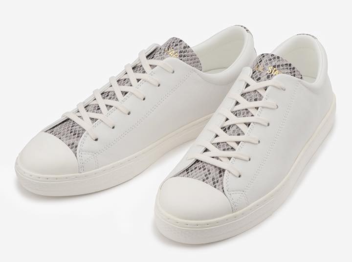 「ALL STAR COUPE SNK OX」(1万4000円/税別)は、シュータンと踵紐にスネーク柄の型押しレザーを使用。スムースレザーのアッパーにスネーク柄が映える、ラグジュアリーな雰囲気を漂わせた一足です。