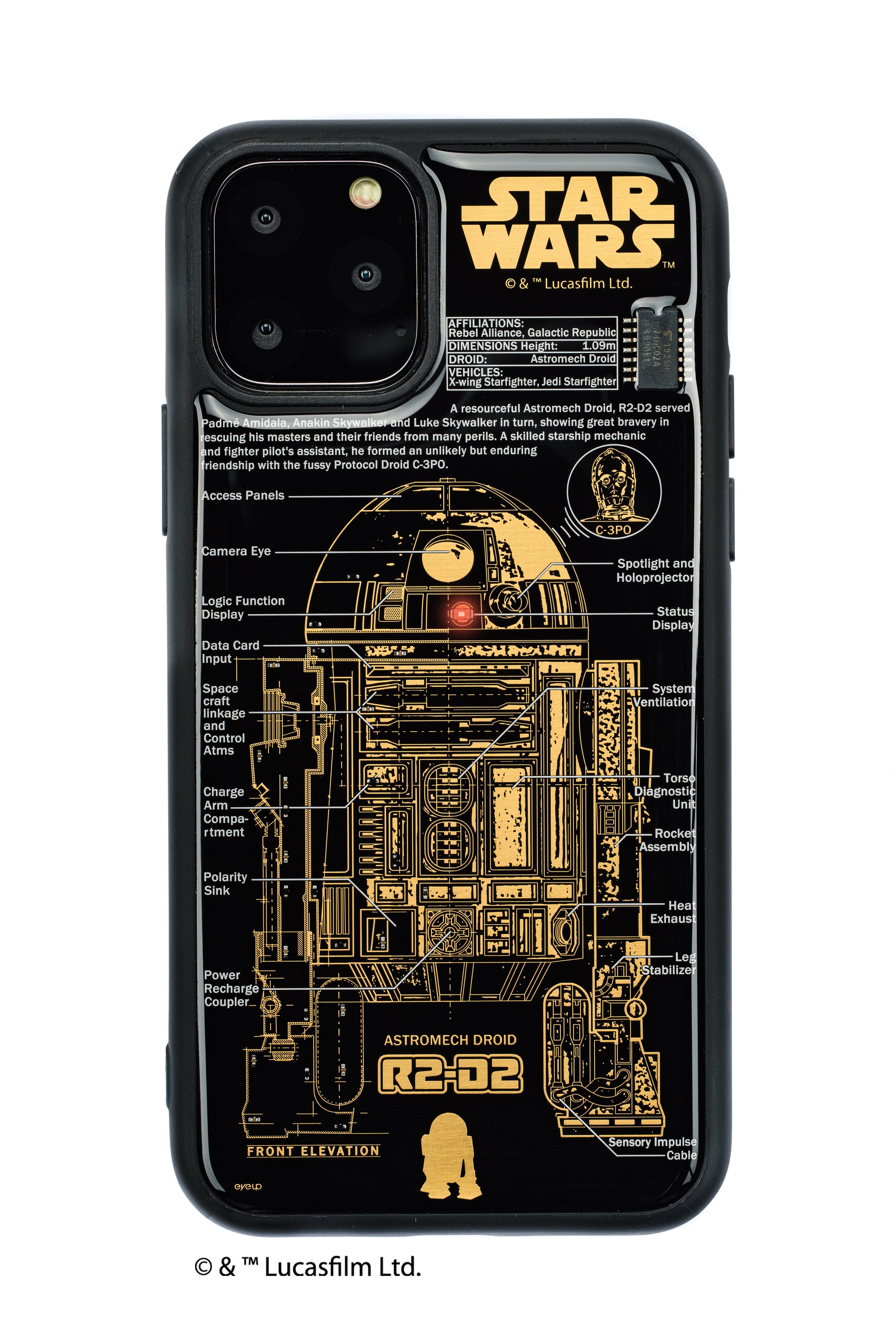 「FLASH R2-D2 基板アート iPhone 11シリーズ用ケース」は、「iPhone 11 Pro」(1万5000円/税別)、「iPhone 11」(1万6000円/税別)、「iPhone 11 Pro MAX」(1万6000円/税別)の3種類で展開。位置探査など情報量が多いグーグルマップ使用時やアプリ使用時など、iPhoneから強い電波が発信された際にR2-D2のステータス・ディスプレイ部に実装されている赤色LEDが光ります。