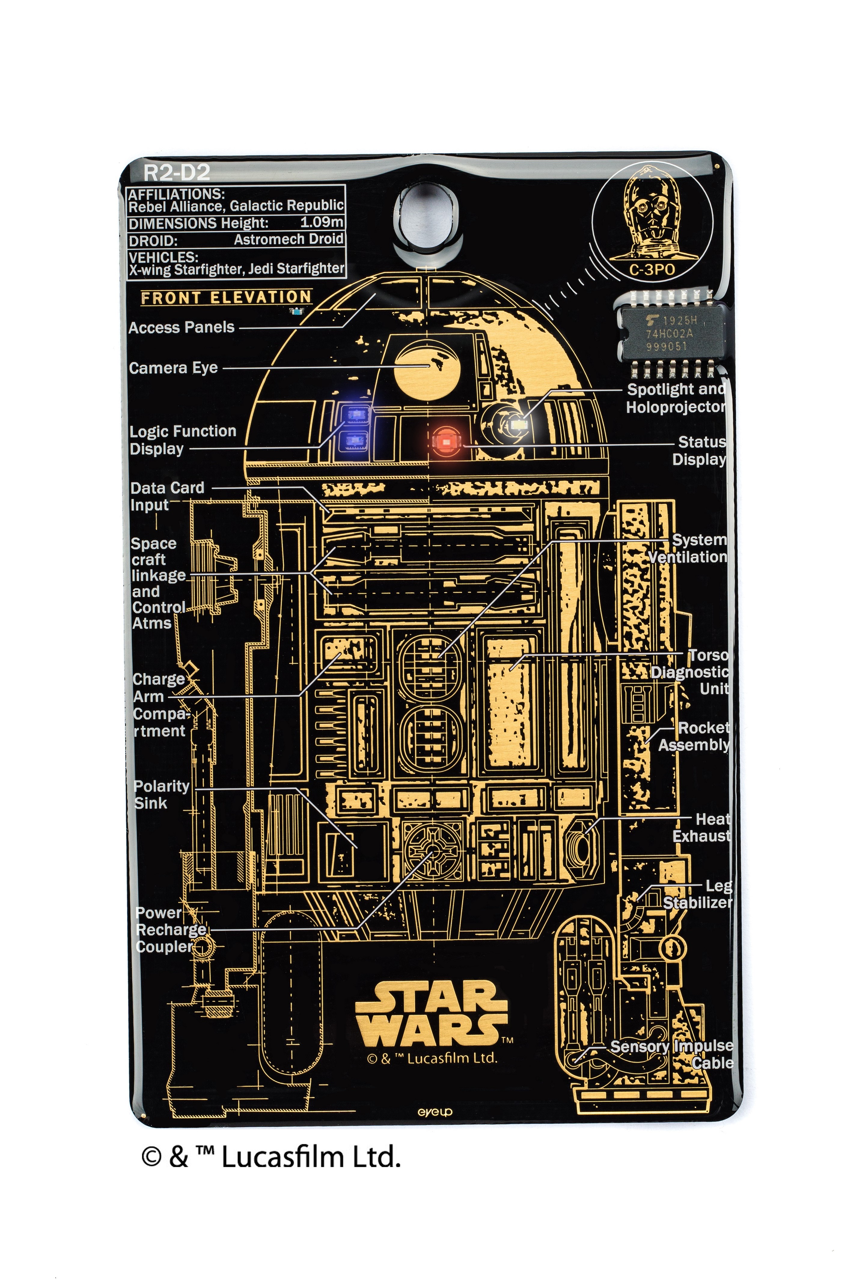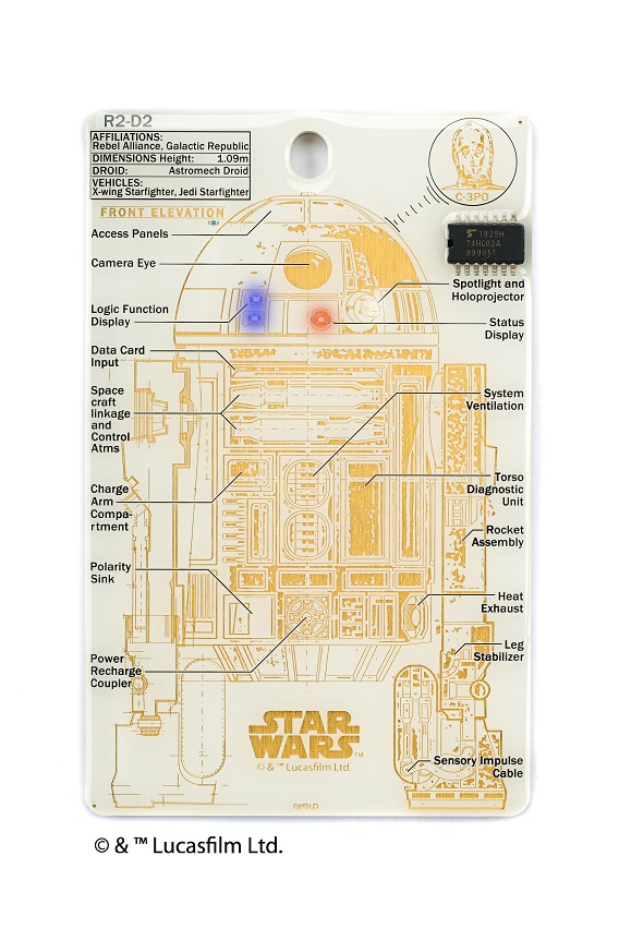 「FLASH R2-D2 基板アート ICカードケース」(1万1000円/税別)は、R2-D2のロジック・ファンクション・ディスプレイ部(青色)、ステータス・ディスプレイ部(赤色)、スポットライト・アンド・ホロプロジェクター部(白色・2個)の、3色計4個のLEDを搭載。