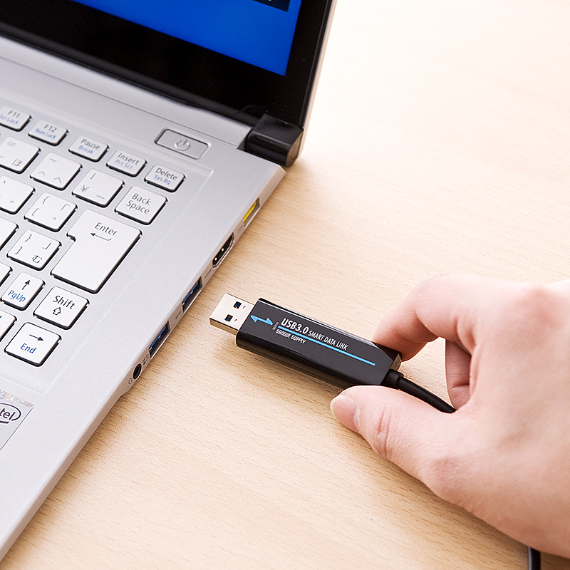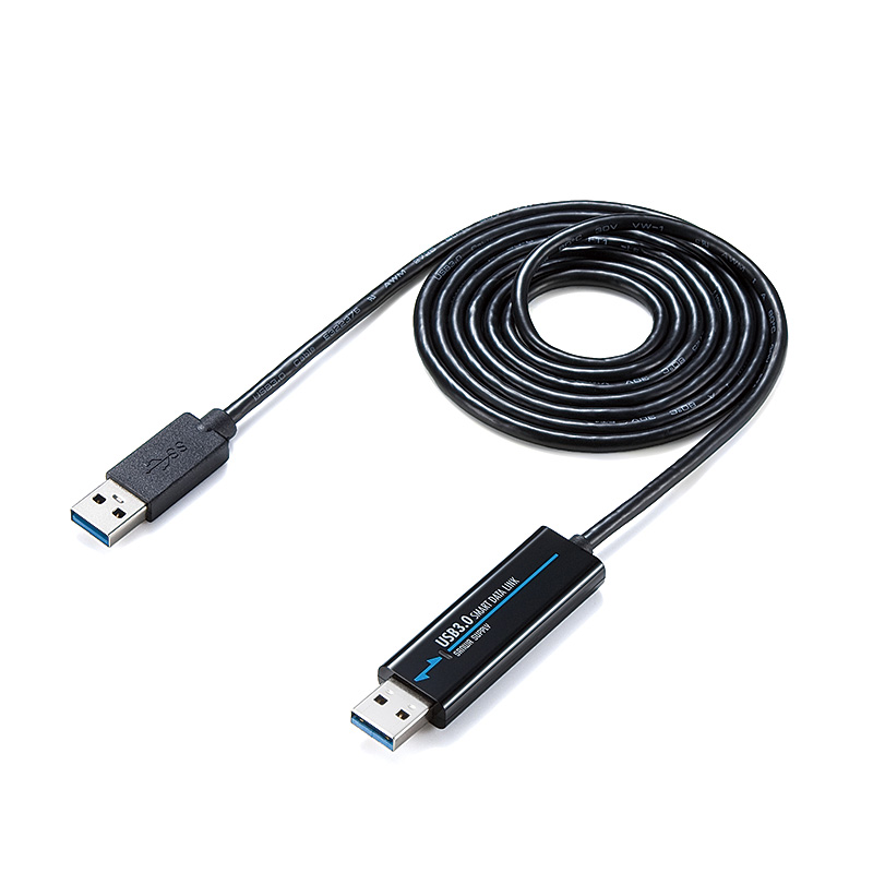 USB3.0対応リンクケーブル「500-USB033」は、2台のパソコンを直接USB接続できるケーブル。ケーブル自体にドライバが内蔵されており、面倒な設定などせずとも、2台をつなぐだけでデータのコピーが可能だ。