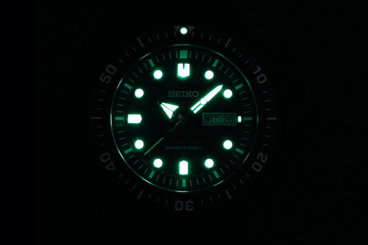 ケースはステンレススチール、ガラスはハードレックス。針とインデックスは暗闇・海中で光るルミブライト仕様。